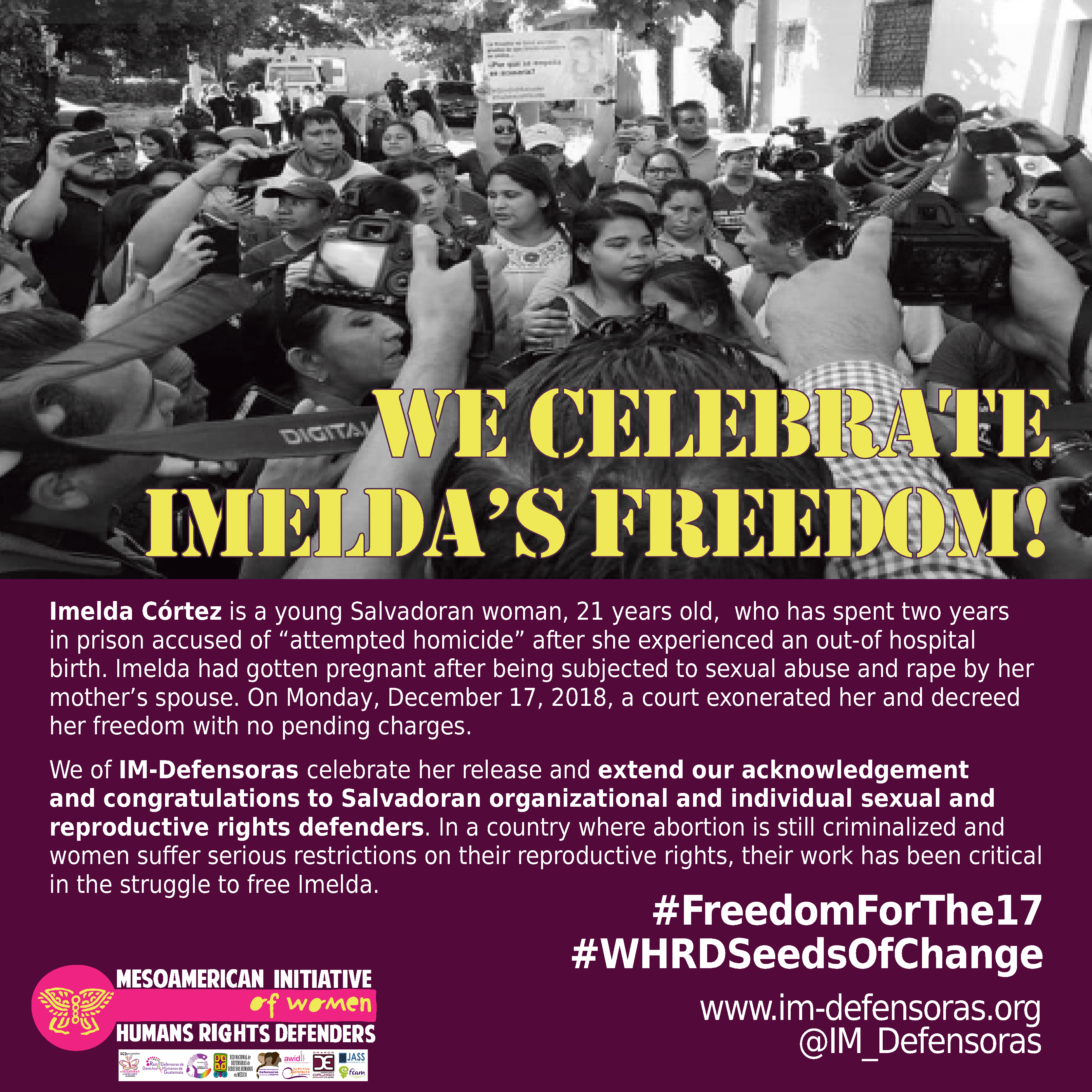 We of IM-Defensoras celebrate her release and extend our acknowledgement and congratulations to Salvadoran organizational and individual sexual and reproductive rights defenders. In a country where abortion is still criminalized and women suffer serious restrictions on their reproductive rights, their work has been critical in the struggle to free Imelda.
