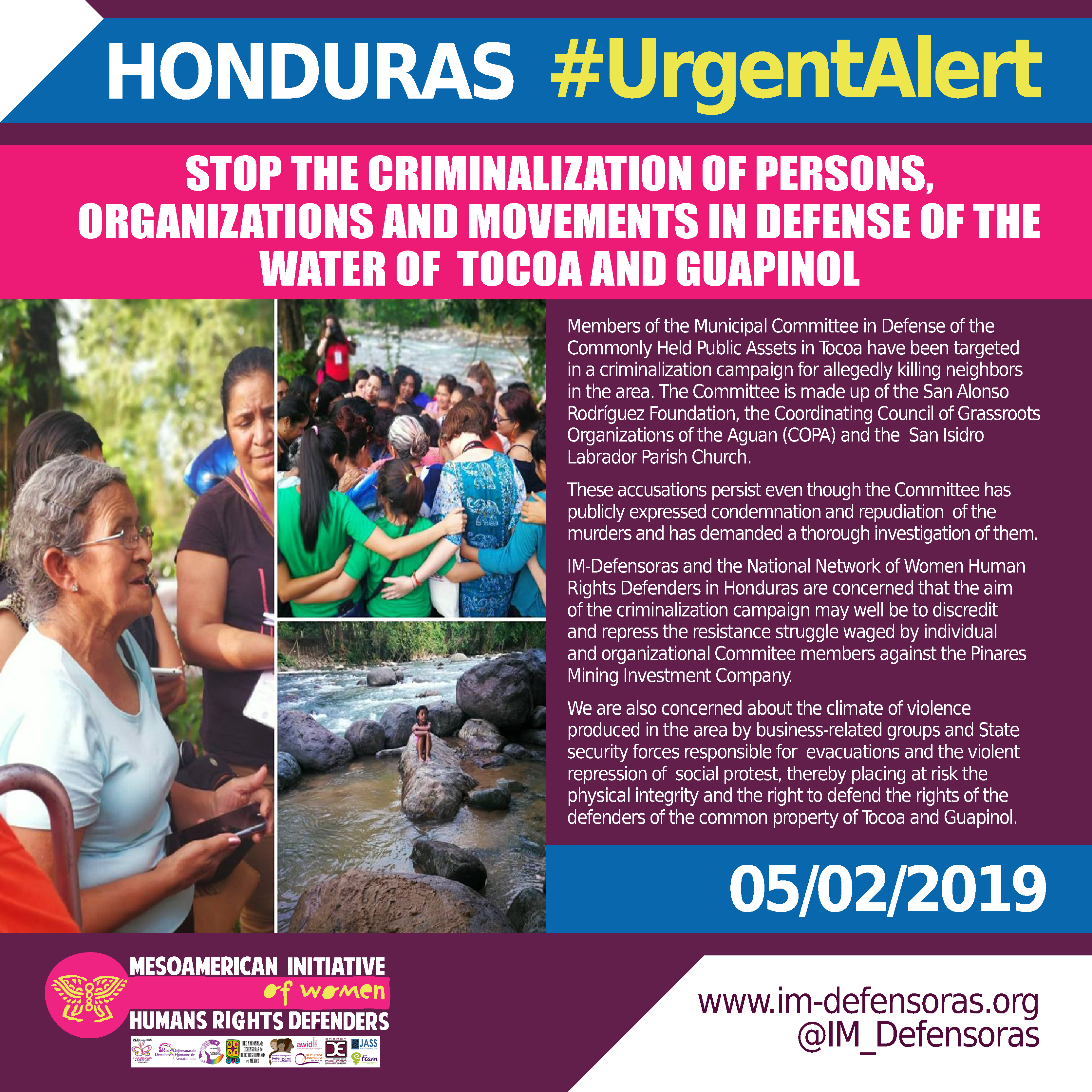 IM-Defensoras and the National Network of Women Human Rights Defenders in Honduras are concerned that the aim of the criminalization campaign may well be to discredit and repress the resistance struggle waged by individual and organizational Commitee members against the Pinares Mining Investment Company.