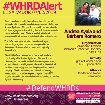 We of IM-Defensoras condemn this attack and stand in solidarity with Andrea Ayala and Bárbara Romero. Likewise, we demand that the Salvadoran government act with the utmost diligence to determine the criminal liabilities involved, guarantee the physical and moral integrity of both defenders, and take all necessary measures to combat hate speech against the LGBTI population and those who defend sexual and reproductive rights in the country.