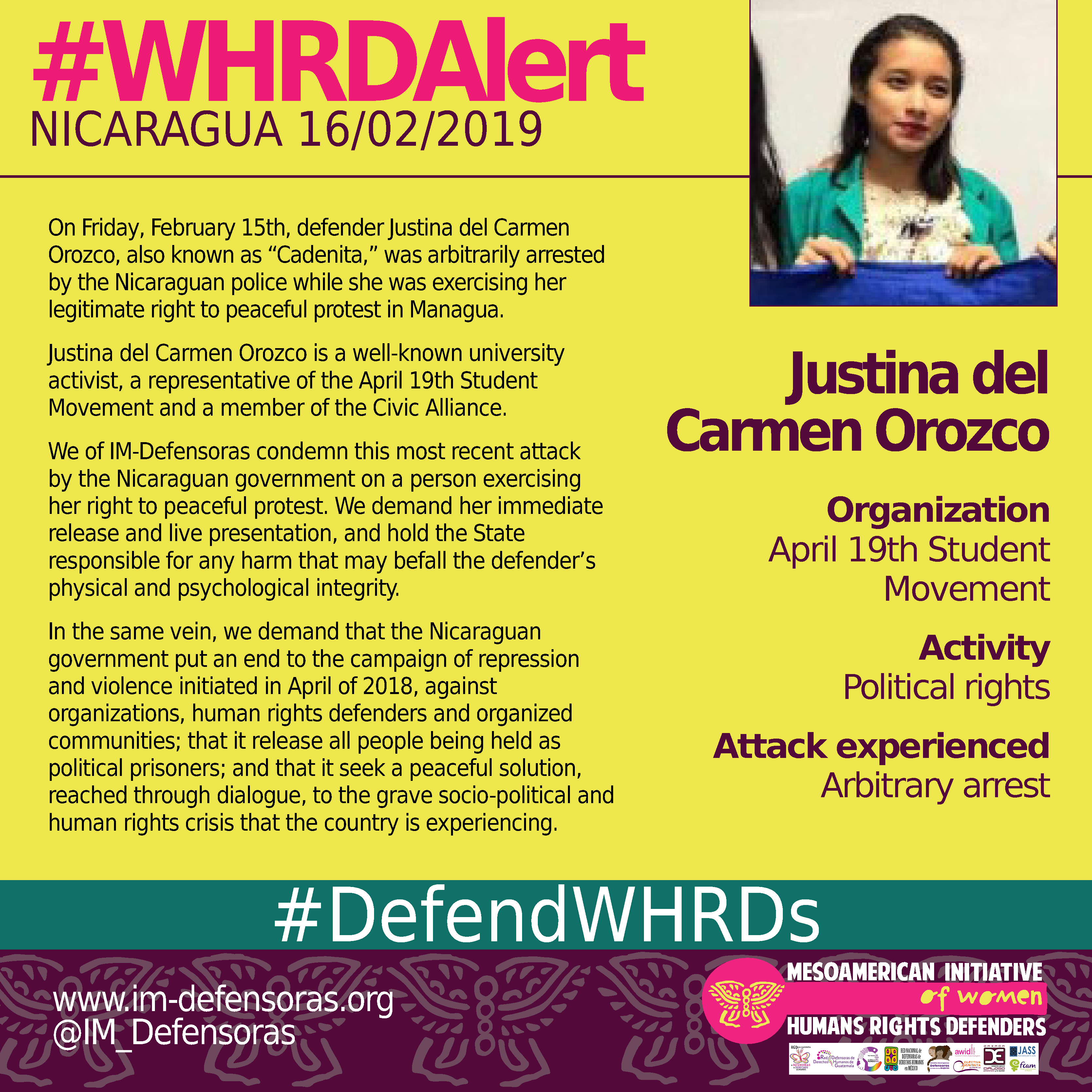 THE FACTS – On Friday, February 15th, defender Justina del Carmen Orozco, also known as “Cadenita,” was arbitrarily arrested by the Nicaraguan police while she was exercising her legitimate right to peaceful protest in Managua.