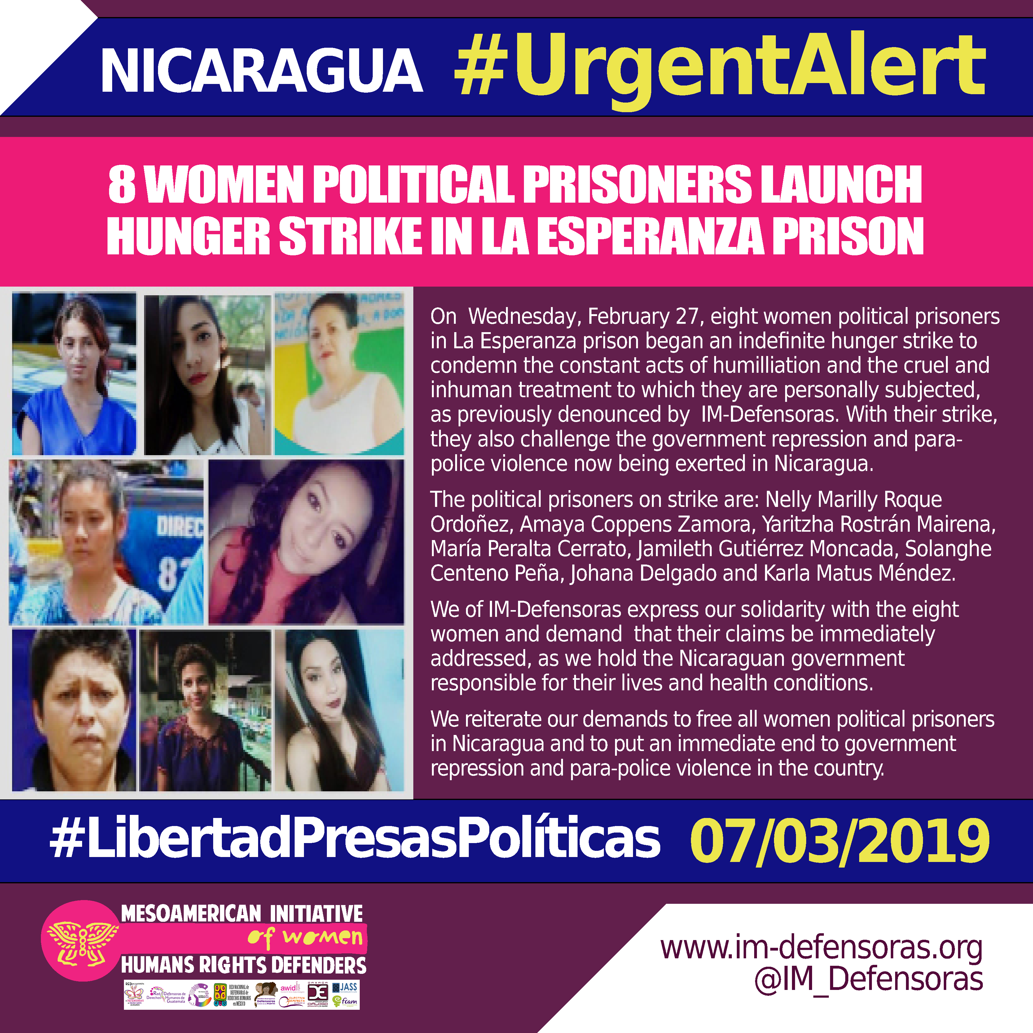 We of IM-Defensoras express our solidarity with the eight women and demand that their claims be immediately addressed, as we hold the Nicaraguan government responsible for their lives and health conditions.