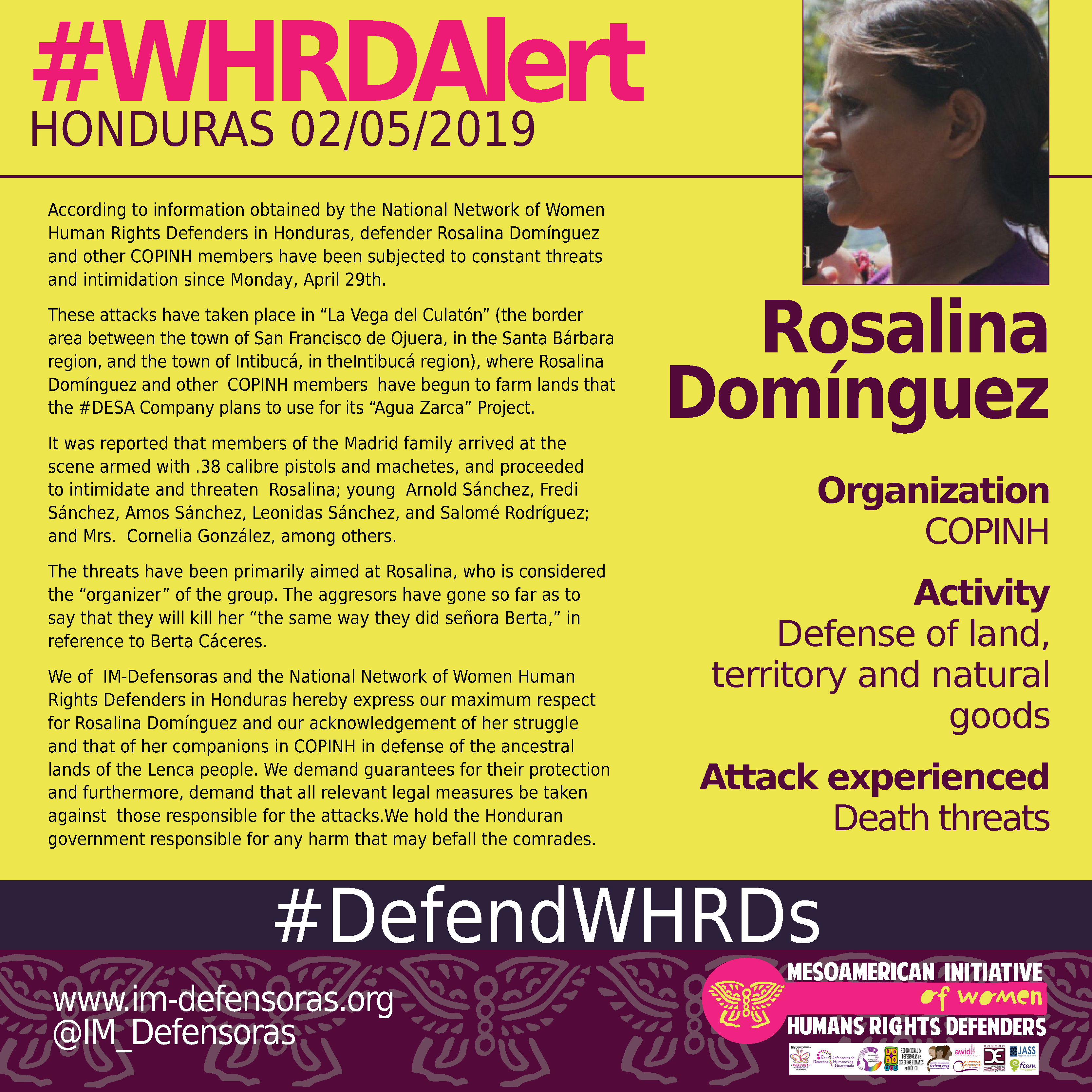 THE FACTS – According to information obtained by the National Network of Women Human Rights Defenders in Honduras, defender Rosalina Domínguez and other COPINH members have been subjected to constant threats and intimidation since Monday, April 29th.