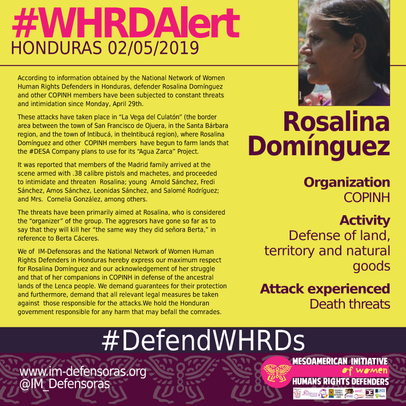 We of IM-Defensoras and the National Network of Women Human Rights Defenders in Honduras hereby express our maximum respect for Rosalina Domínguez and our acknowledgement of her struggle and that of her companions in COPINH in defense of the ancestral lands of the Lenca people. We demand guarantees for their protection and furthermore, demand that all relevant legal measures be taken against those responsible for the attacks.We hold the Honduran government responsible for any harm that may befall the comrades.