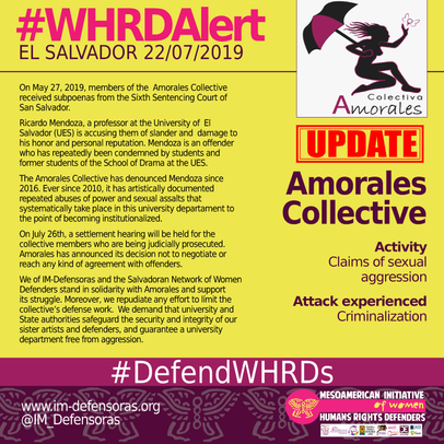 We of IM-Defensoras and the Salvadoran Network of Women Defenders stand in solidarity with Amorales and support its struggle. Moreover, we repudiate any effort to límit the collective’s defense work. We demand that university and State authorities safeguard the security and integrity of our sister artists and defenders, and guarantee a university department free from aggression.