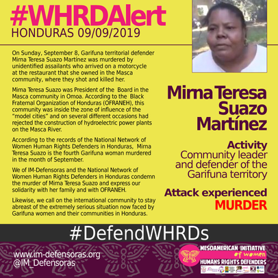 We of IM-Defensoras and the National Network of Women Human Rights Defenders in Honduras condemn the murder of Mirna Teresa Suazo and express our solidarity with her family and with OFRANEH.