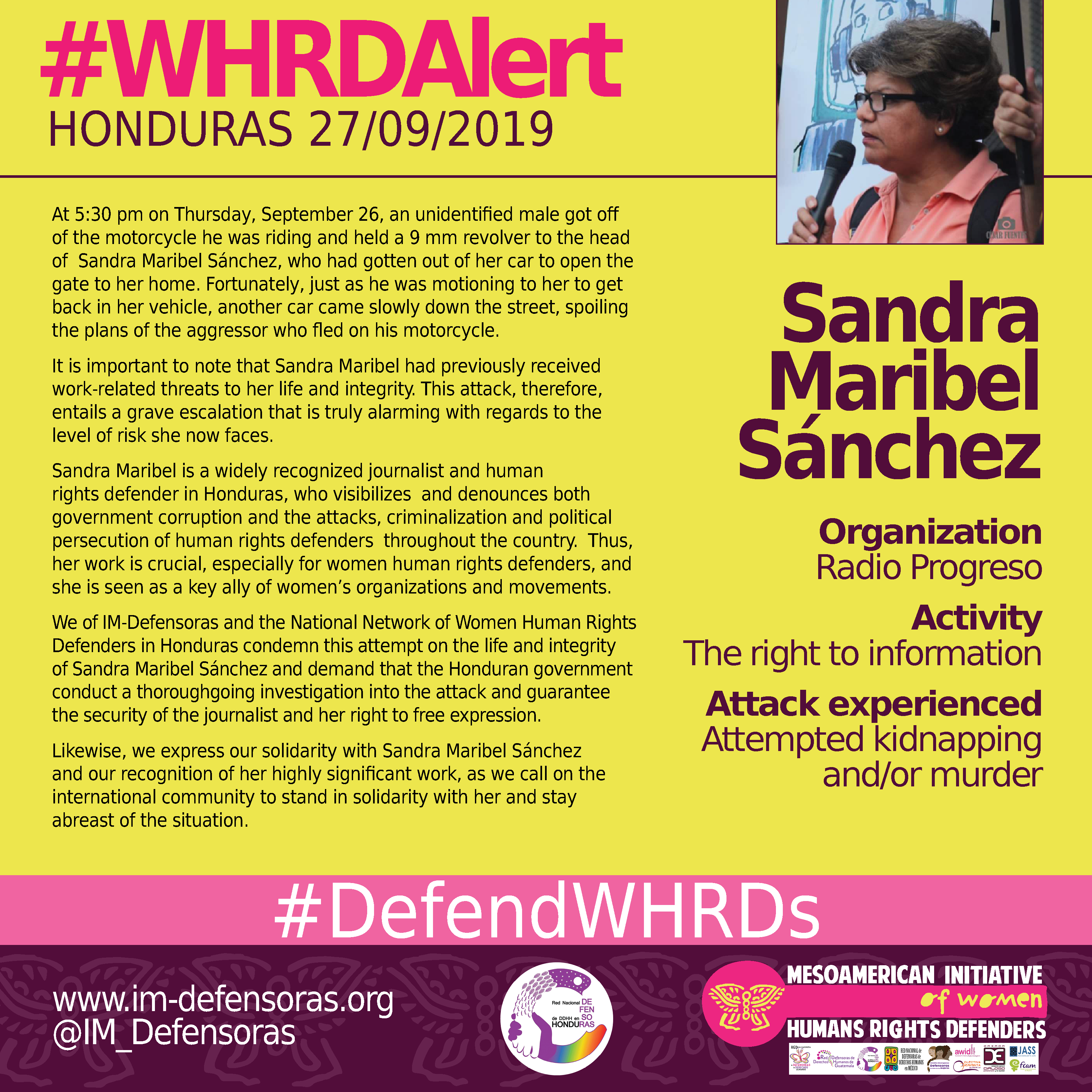 We of IM-Defensoras and the National Network of Women Human Rights Defenders in Honduras condemn this attempt on the life and integrity of Sandra Maribel Sánchez and demand that the Honduran government conduct a thoroughgoing investigation into the attack and guarantee the security of the journalist and her right to free expression.