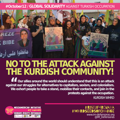 We of IM-Defensoras join in the call of the Kurdish women defenders to the international community, organizations, and social movements to take a stand and demand an immediate end to any Turkish attacks and the occupation of Syria. Let’s join the protests in our countries and demand an end to war, the Turkish occupation, and the ethnic cleansing of the Kurdish people.