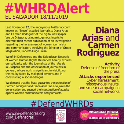 We of IM-Defensoras and the Salvadoran Network of Women Human Rights Defenders hereby express our solidarity with the journalists of the Voz de la Diáspora and the Association of Journalists in general, whose work is significant in visibilizing the reality faced by maligned persons and in constructing a social dialogue.