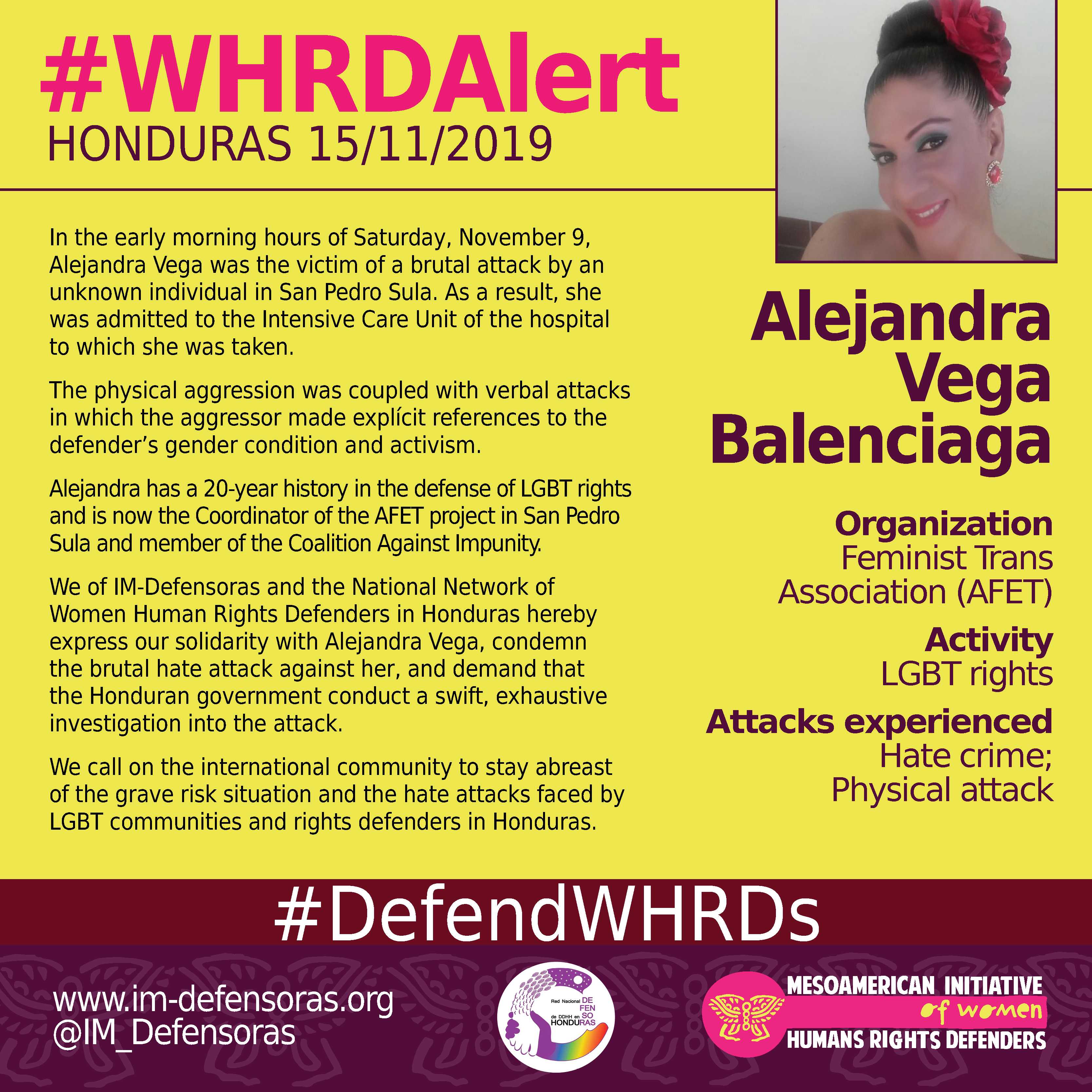 We of IM-Defensoras and the National Network of Women Human Rights Defenders in Honduras hereby express our solidarity with Alejandra Vega, condemn the brutal hate attack against her, and demand that the Honduran government conduct a swift, exhaustive investigation into the attack.