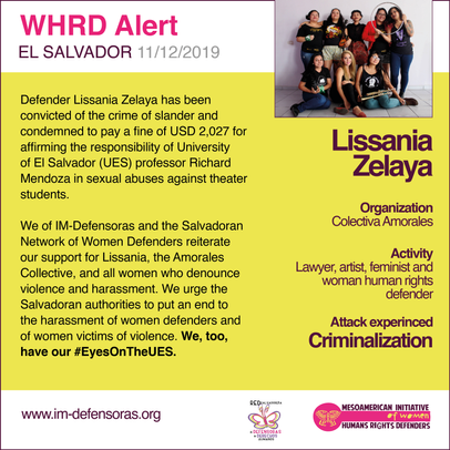 We of IM-Defensoras and the Salvadoran Network of Women Defenders reiterate our support for Lissania, the Amorales Collective, and all women who denounce violence and harassment. We urge the Salvadoran authorities to put an end to the harassment of women defenders and of women victims of violence. We, too, have our #EyesOnTheUES.
