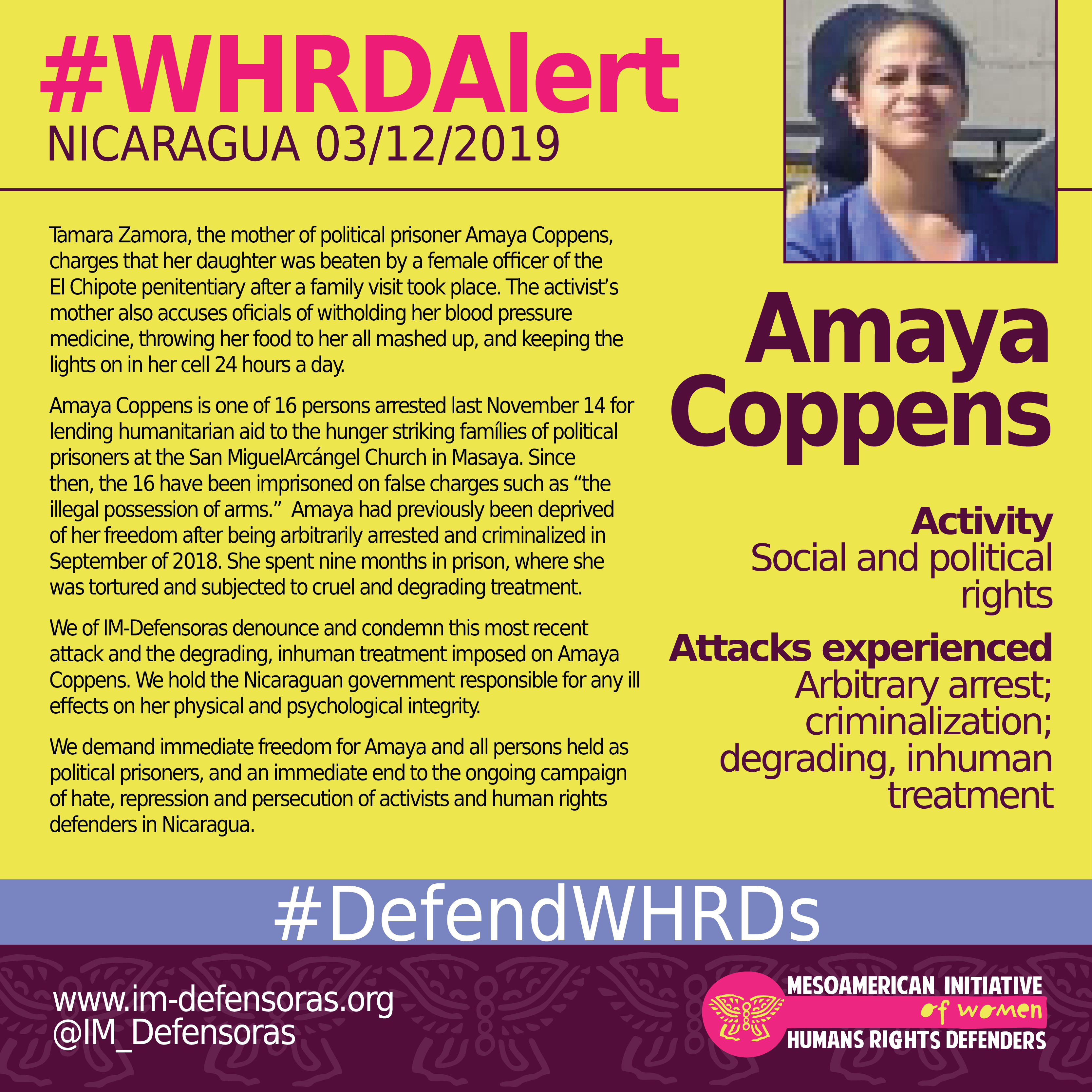 We of IM-Defensoras denounce and condemn this most recent attack and the degrading, inhuman treatment imposed on Amaya Coppens. We hold the Nicaraguan government responsible for any ill effects on her physical and psychological integrity.