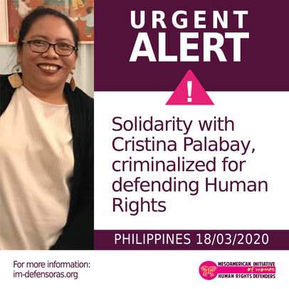 We of IM-Defensoras hereby express our solidarity with Cristina Palabay, Karapatan, and all persons and organizations under attack by the Philippines government. We demand an immediate end to their criminalization and guarantees for the respect of their security and safety, physical and moral integrity, and right to defend rights.