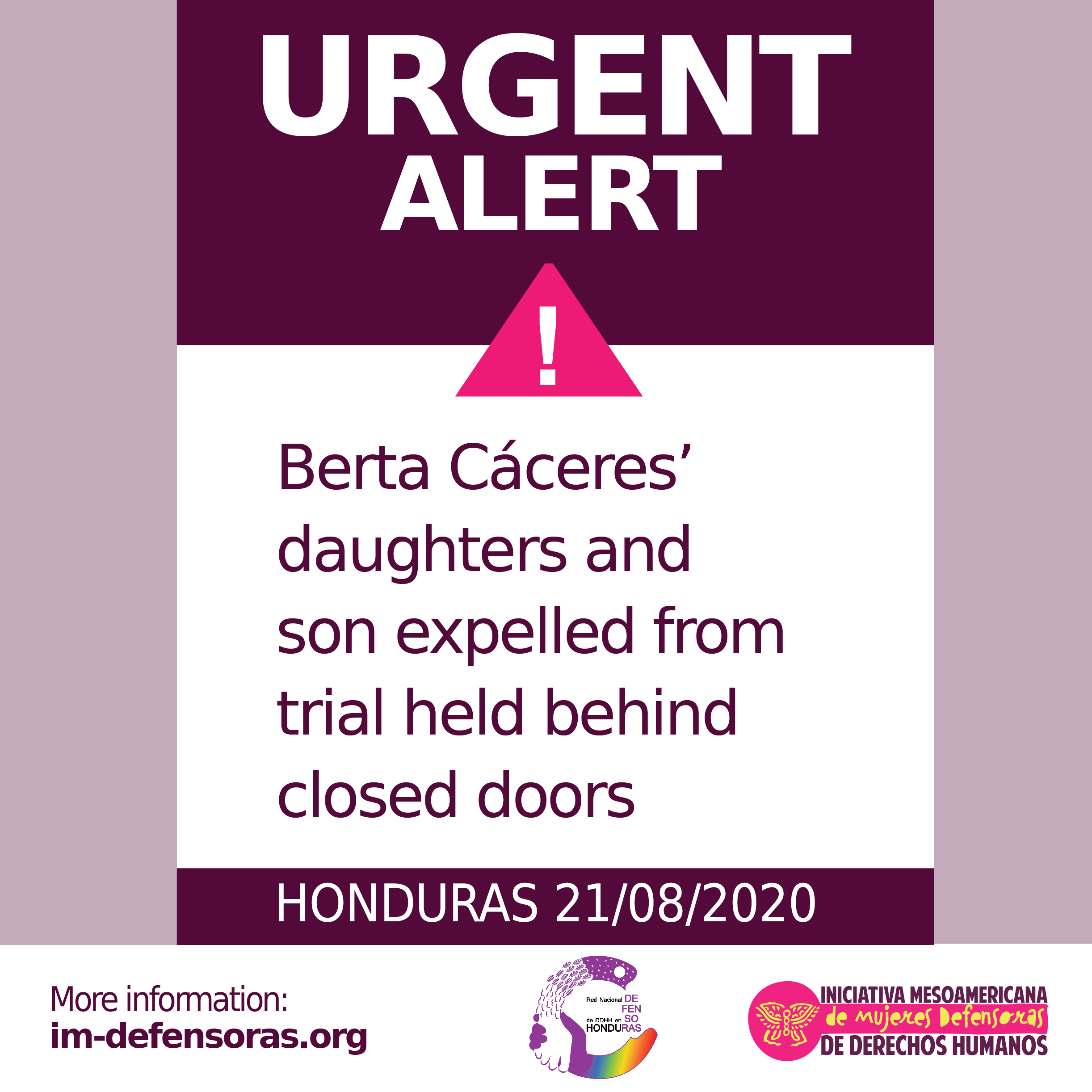 On August 21, 2020, Judge Carlos Irías de León, a newcomer to the judicial process involving the murder of Berta Caceres, decided to expel her son and daughters, who were to testify against an individual implicated in her murder, David Castillo. The judge also canceled the live transmission that was to be screened on the web page of the Honduran Judiciary.