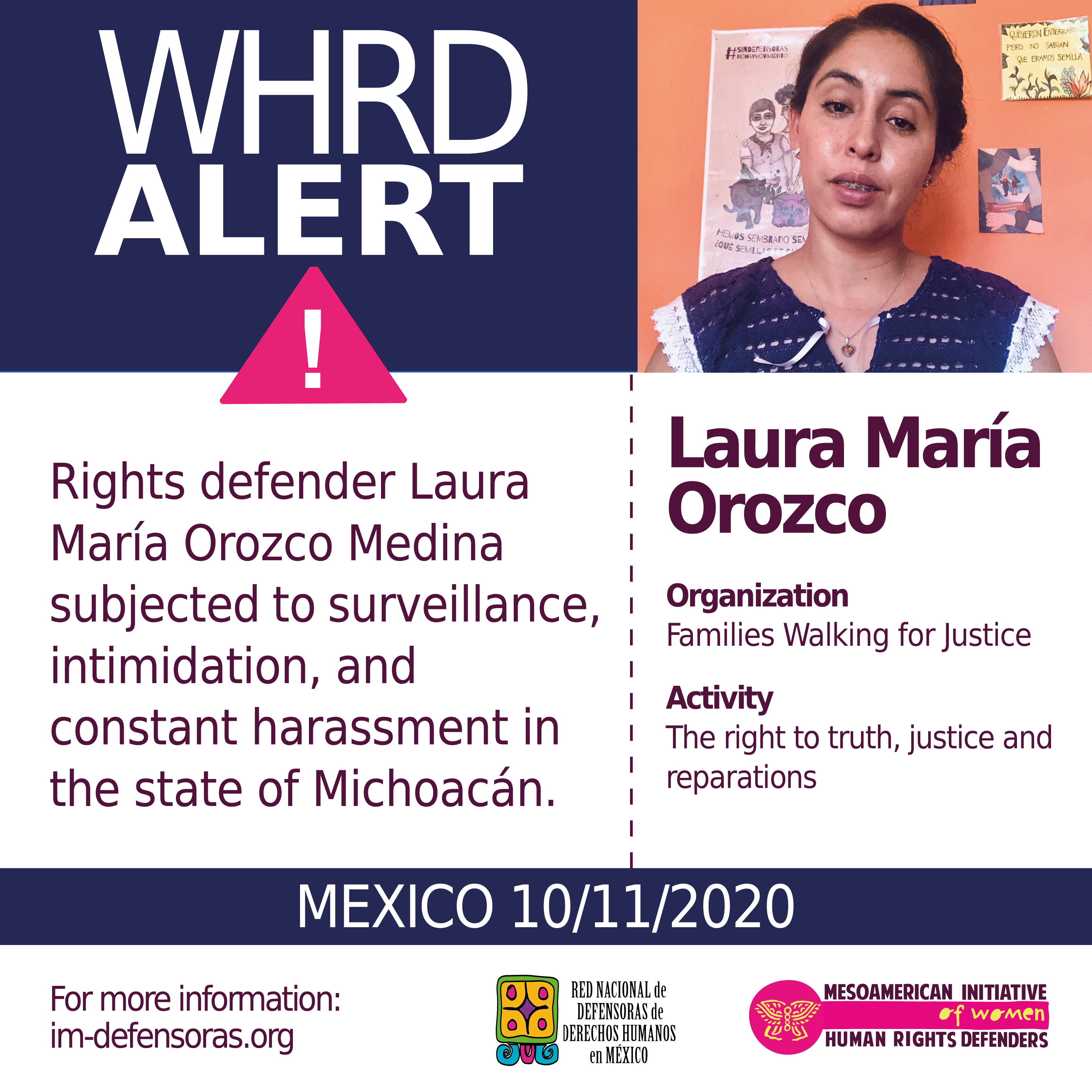 We of IM-Defensoras and the National Network for Women Human Rights Defenders in Mexico hereby demand that authorities at all levels in the state of Michoacán and in the federal government put an end to the highly serious attacks against defender Laura Orozco, her family, and the Families Walking for Justice Collective; moreover, we demand guarantees for their safety and security and for their ability to continue working in defense of human rights.