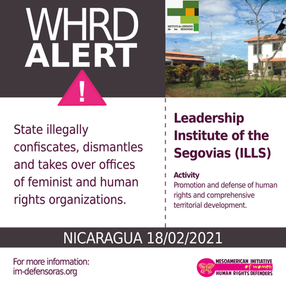 The root of these acts goes back to December 13, 2018, when the National Assembly arbitrarily canceled the legal status of nine human rights organizations and two news outlets, including the Leadership Institute of the Segovias and CENIDH, organizations that are led by defenders of human rights, women, and the freedom of expression. None of the organizations in question was involved in a judicial process or an administrative process, and none was allowed the right to defense. Even though all had submitted writs of protection and charged unconstitutionality before the Supreme Court of Justice, their cases have not been resolved to date. Since then, their offices have been occupied by police forces and armed anti-riot squads. At the end of December 2020, the government hung a number of signs announcing that the occupied buildings were State property and that alleged programs would fall under the Ministry of Health.