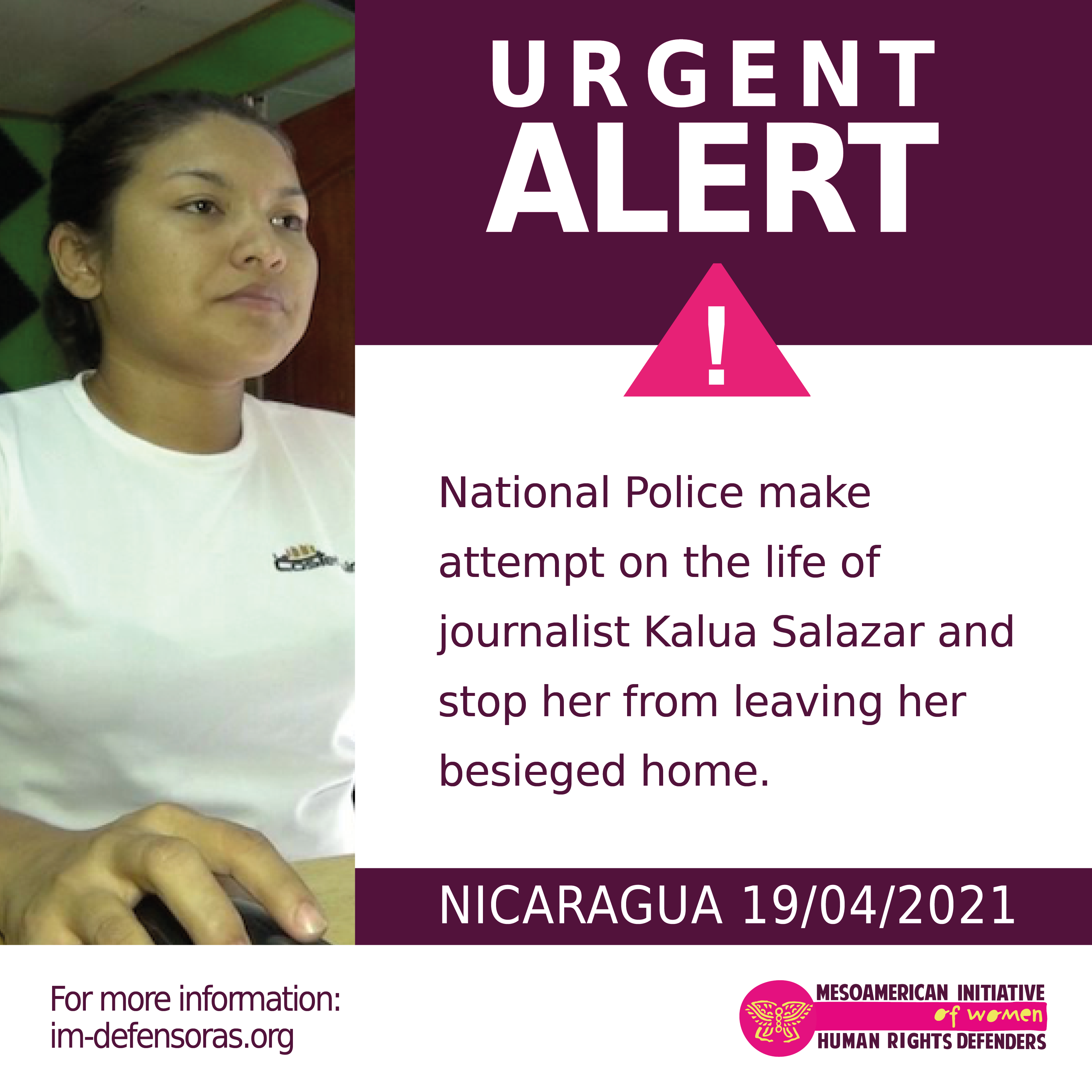 We of IM-Defensoras condemn this serious attack on the life of the journalist Kalua Salazar, and on the besiegement, intimidation, and constant threats that she and her family are experiencing. We demand an immediate end to these attacks and hold the Nicaraguan government responsible for any violation whatsoever of the integrity of Kalua Salazar and her family.