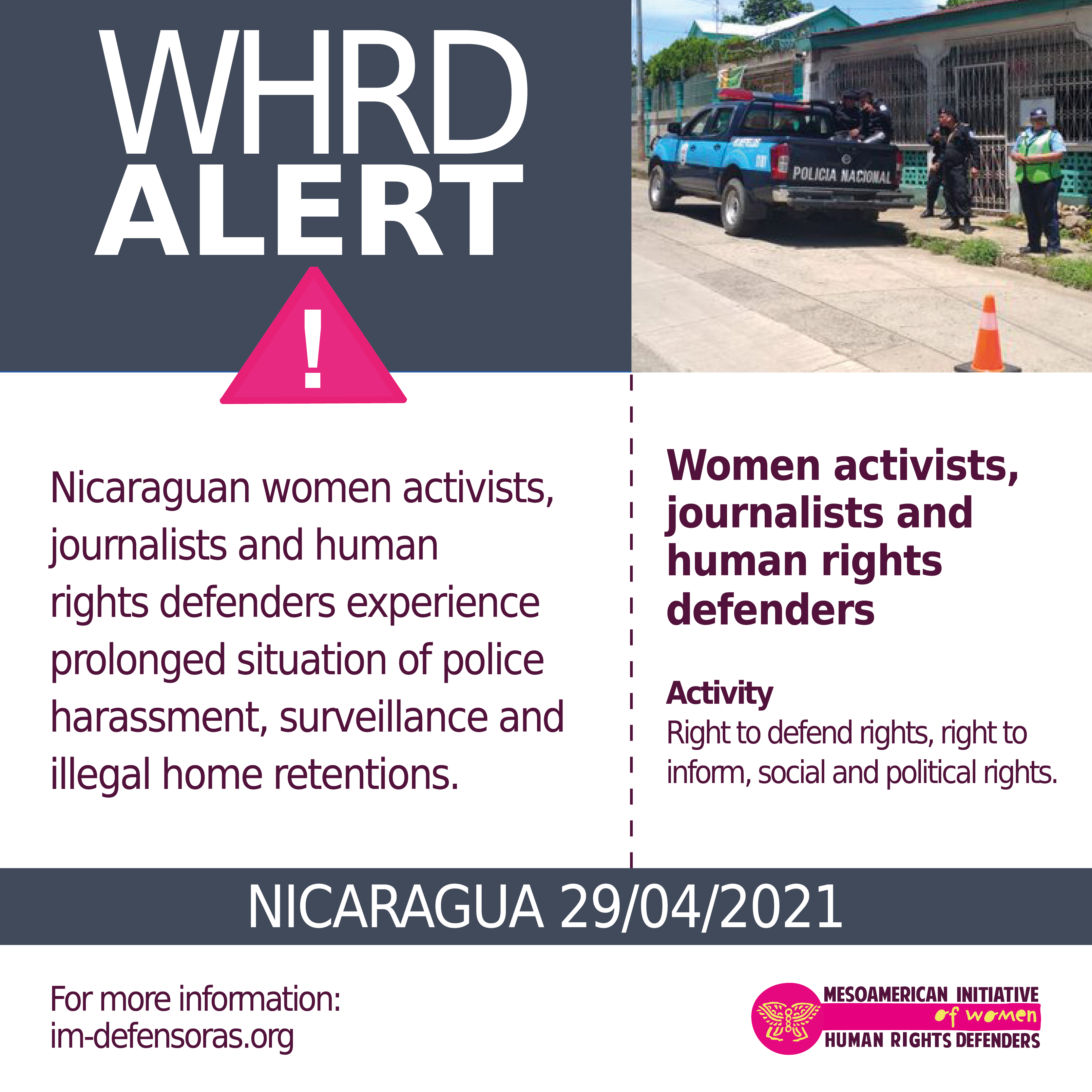 Since last April 18th, in the context of the commemoration of the anniversary of the social uprising of 2018, the police harassment of women activists, journalists and human rights defenders has intensified. Such harassment has taken place repeatedly and systematically along with restrictions on freedom of movement and acts of surveillance, persecution and illegal home retentions for as long as a week, all with the aim of preventing women defenders from mobilizing to pursue their legitimate right to protest.