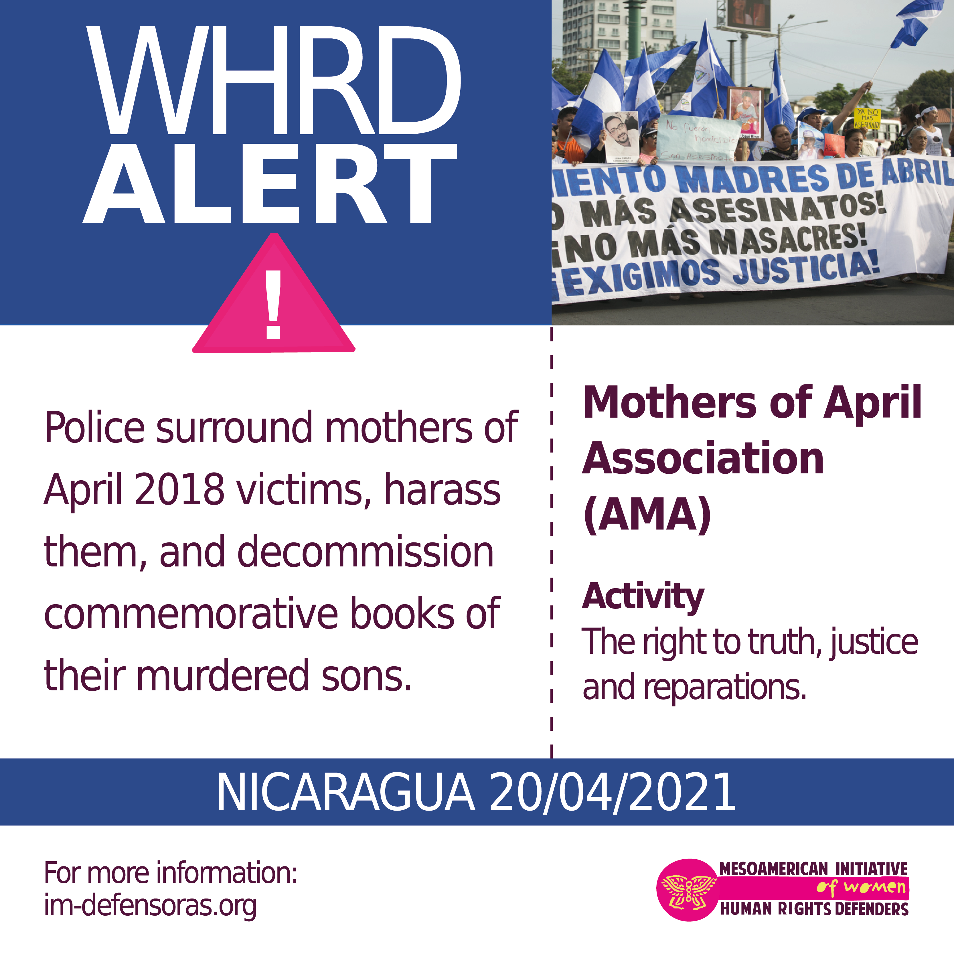 On Monday, April 19, a group of women defenders belonging to the Mothers of April Association (AMA) in Masaya and Carazo were surrounded and harassed by police agents at a bus stop outside the Central American University (UCA). The agents decommissioned their commemorative books published to demand truth, justice and reparations for the murders of their children during the social uprising of April 18, 2018. The police searched the mothers’ bags, spoke to them aggressively, threatened to detain them, and told them that they had their addresses.