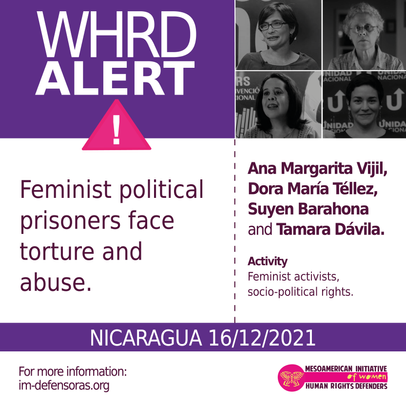 Feminist activists Ana Margarita Vijil, Dora María Téllez, Suyen Barahona, and Tamara Dávila have been imprisoned since last June, when they were violently arrested. All of them experience freedom deprivation and violation of their human rights in conditions which, according to international norms, constitute acts of torture and cruel, inhuman, and degrading treatment.