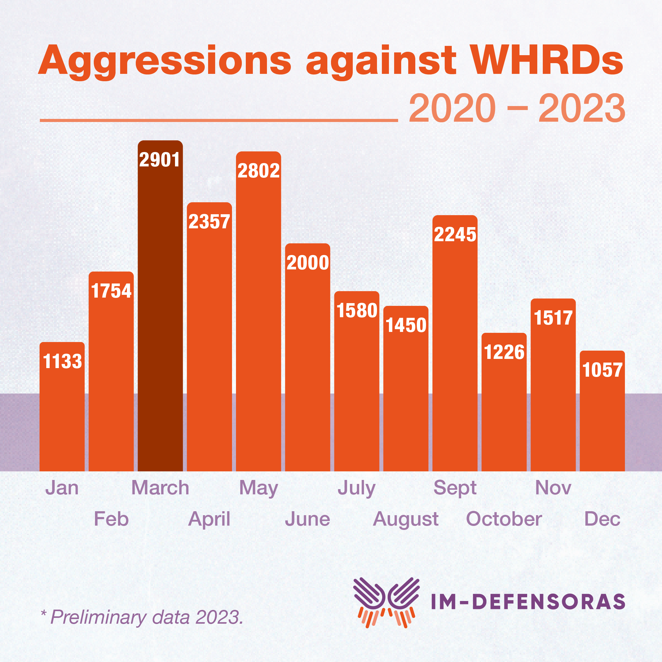 A retrospective analysis of the information documented in our registry of attacks reveals that in recent years, the month of March has marked the highest peak in annual attacks against women defenders. During the months of March in the last four years – from 2020 to 20231 – we documented 2,901 attacks in Mexico, Honduras, El Salvador and Nicaragua.