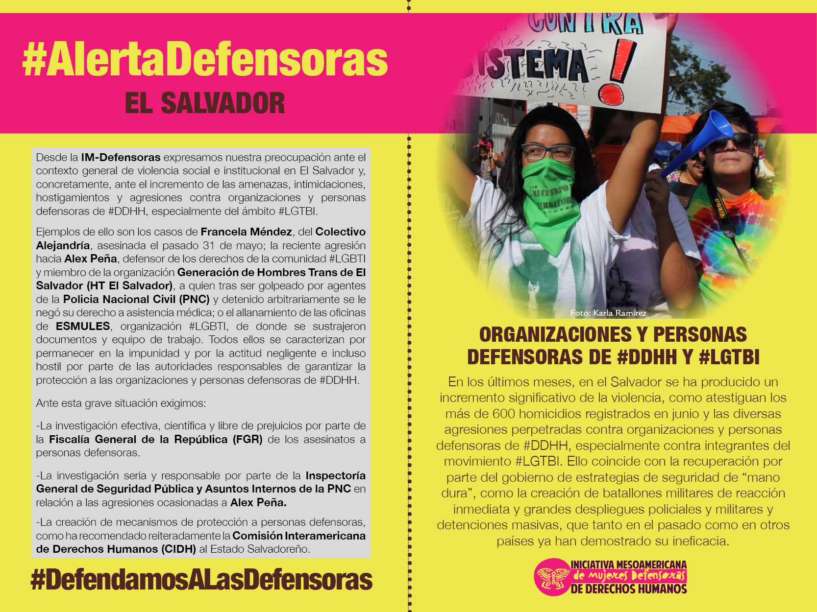 Desde la IM-Defensoras expresamos nuestra preocupación ante el contexto general de violencia social e institucional en El Salvador y, concretamente, ante el incremento de las amenazas, intimidaciones, hostigamientos y agresiones contra organizaciones y personas defensoras de #DDHH, especialmente del ámbito #LGTBI.