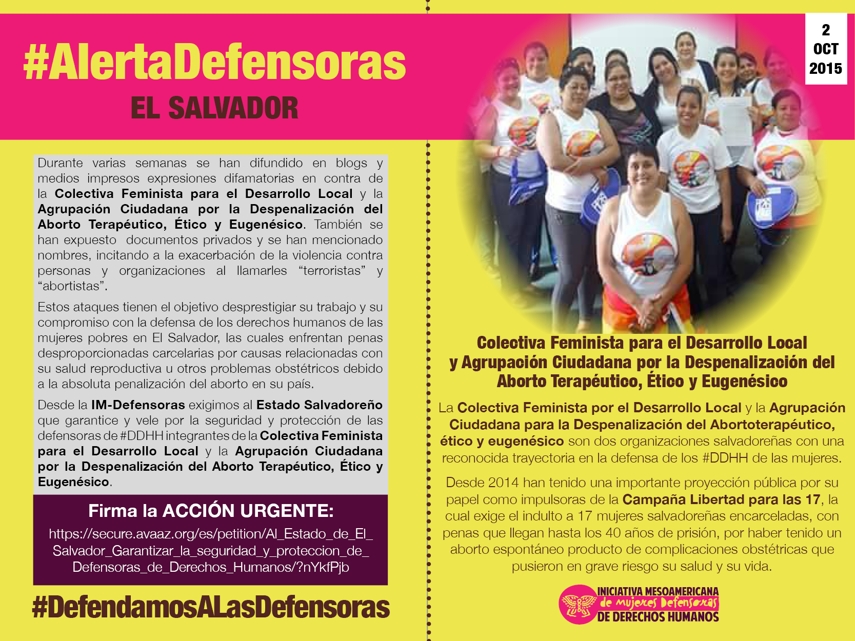 Desde la IM-Defensoras exigimos al Estado Salvadoreño que garantice y vele por la seguridad y protección de las defensoras de #DDHH integrantes de la Colectiva Feminista para el Desarrollo Local y la Agrupación Ciudadana por la Despenalización del Aborto Terapéutico, Ético y Eugenésico.