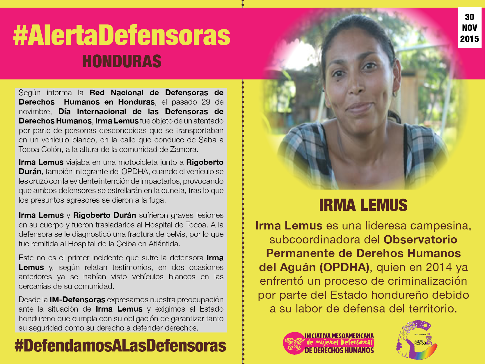 Según informa la Red Nacional de Defensoras deDerechos Humanos en Honduras, el pasado 29 de novimbre, Día Internacional de las Defensoras de Derechos Humanos, Irma Lemus fue objeto de un atentado por parte de personas desconocidas que se transportaban en un vehículo blanco, en la calle que conduce de Saba a Tocoa Colón, a la altura de la comunidad de Zamora.