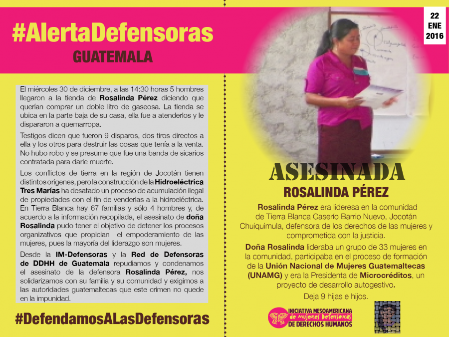 Desde la IM-Defensoras y la Red de Defensoras de DDHH de Guatemala repudiamos y condenamos el asesinato de la defensora Rosalinda Pérez, nos solidarizamos con su familia y su comunidad y exigimos a las autoridades guatemaltecas que este crimen no quede en la impunidad.