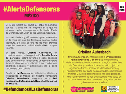 Cristina Auerbach, integrante de la Organización Familia Pasta de Conchos se involucró en la defensa de derechos humanos en la región carbonífera de Coahuila, y desde entonces ha sido objeto de agresiones físicas, amenazas, descalificaciones y hostigamientos por parte de autoridades, empresarios mineros y sujetos desconocidos. Ha sido golpeada, difamada y sufrió intentos de asesinato y de cateo en su casa, tiene medidas cautelares otorgadas por los gobiernos estatal y federal.