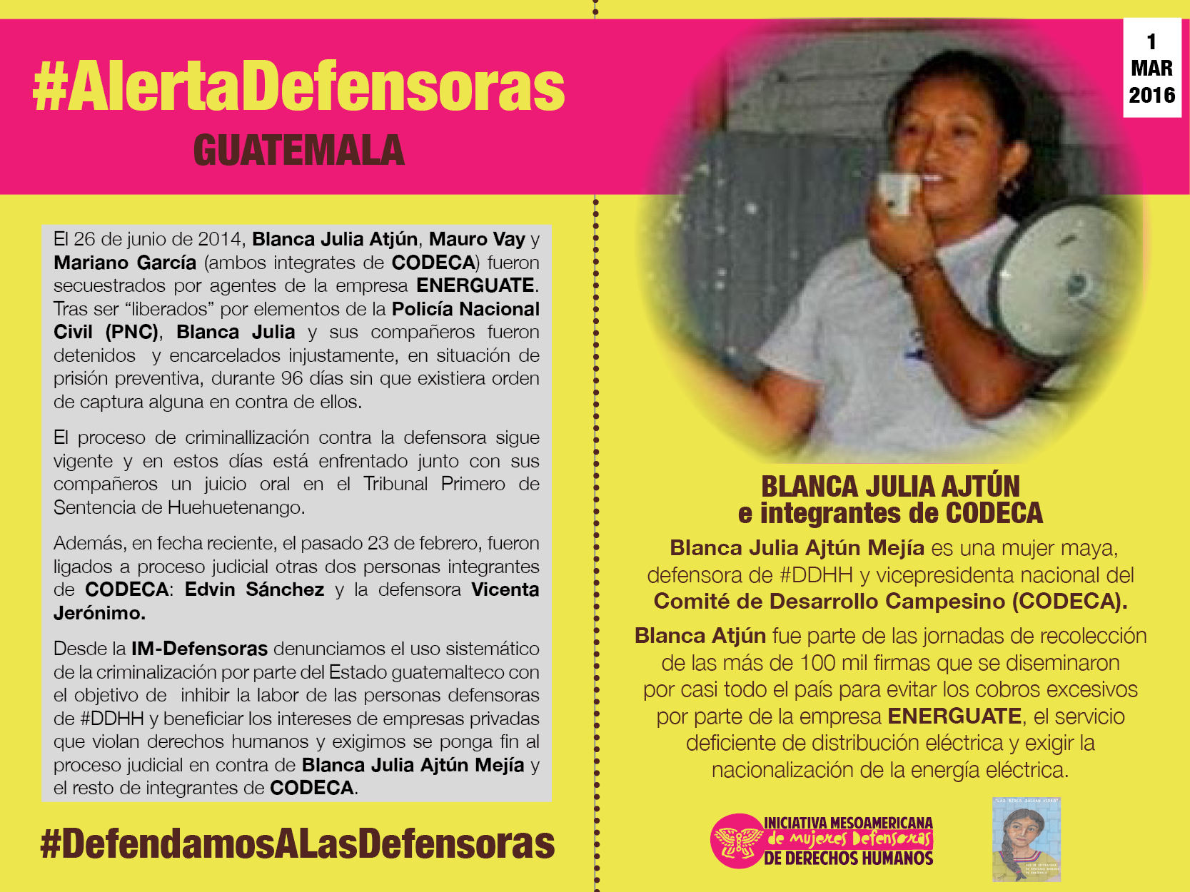 El 26 de junio de 2014, Blanca Julia Atjún, Mauro Vay y Mariano García (ambos integrates de CODECA) fueron secuestrados por agentes de la empresa ENERGUATE. Tras ser “liberados” por elementos de la Policía Nacional Civil (PNC), Blanca Julia y sus compañeros fueron detenidos y encarcelados injustamente, en situación de prisión preventiva, durante 96 días sin que existiera orden de captura alguna en contra de ellos.