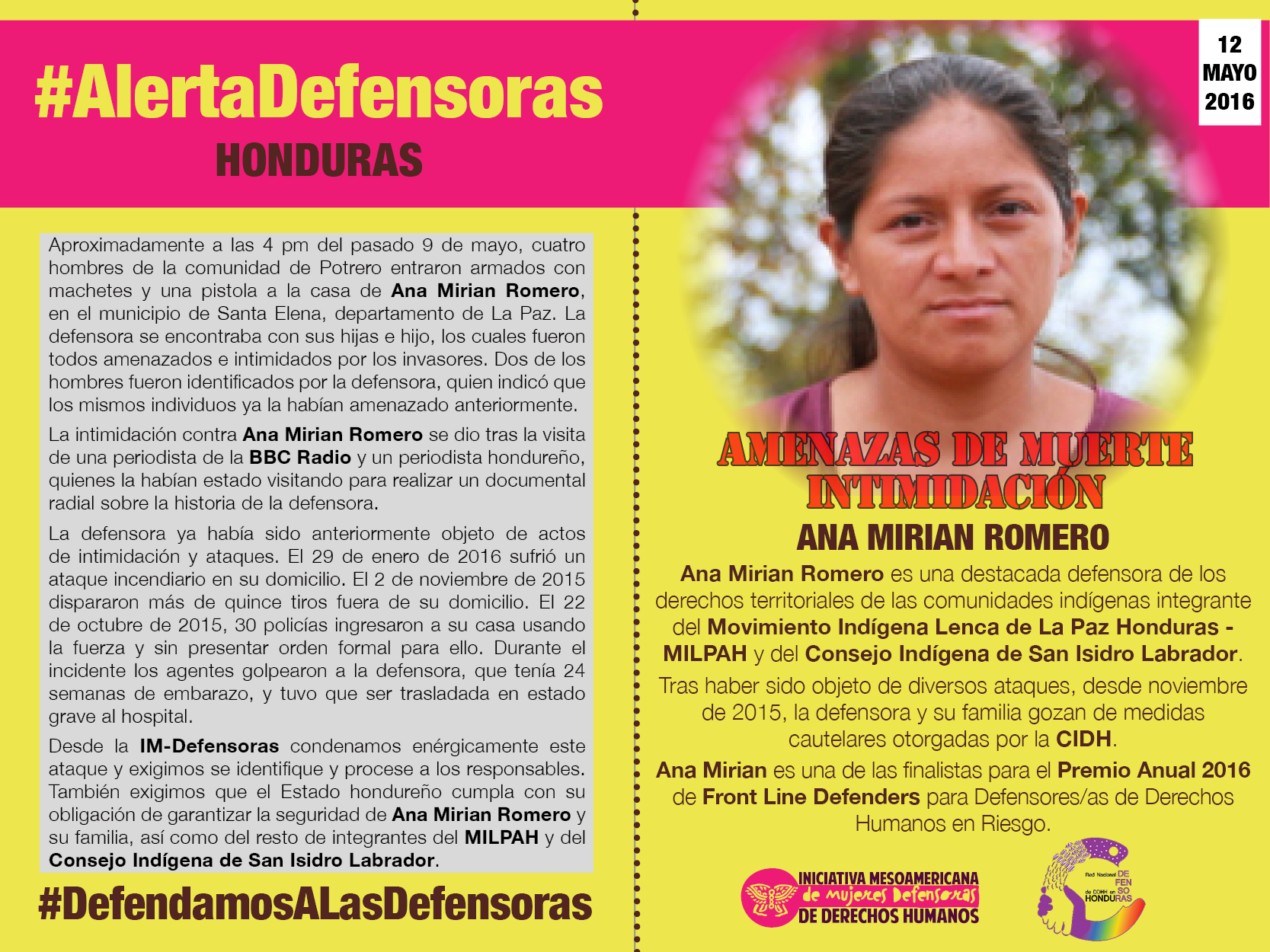 Ana Mirian Romero es una destacada defensora de los derechos territoriales de las comunidades indígenas integrante del Movimiento Indígena Lenca de La Paz Honduras - MILPAH y del Consejo Indígena de San Isidro Labrador.