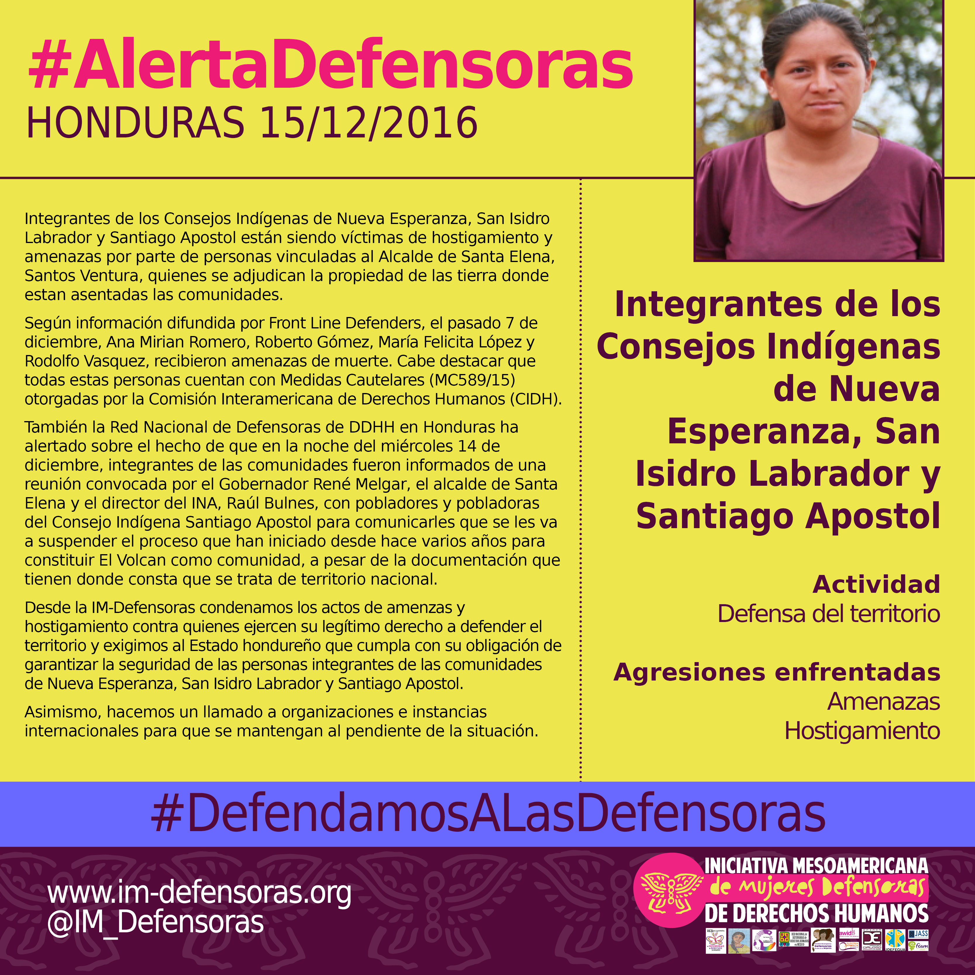 Desde la IM-Defensoras condenamos los actos de amenzas y hostigamiento contra quienes ejercen su legítimo derecho a defender el territorio y exigimos al Estado hondureño que cumpla con su obligación de garantizar la seguridad de las personas integrantes de las comunidades de Nueva Esperanza, San Isidro Labrador y Santiago Apostol.