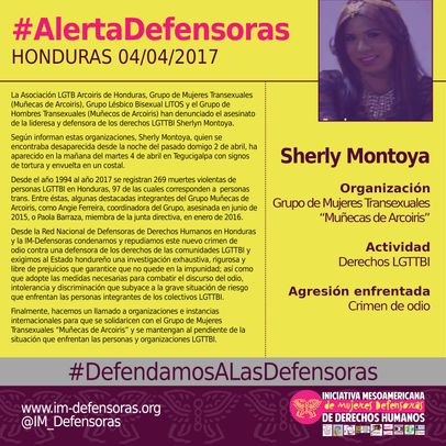 HECHOS - La Asociación LGTB Arcoiris de Honduras, Grupo de Mujeres Transexuales (Muñecas de Arcoiris), Grupo Lésbico Bisexual LITOS y el Grupo de Hombres Transexuales (Muñecos de Arcoiris) han denunciado el asesinato de la lideresa y defensora de los derechos LGTTBI Sherlyn Montoya.