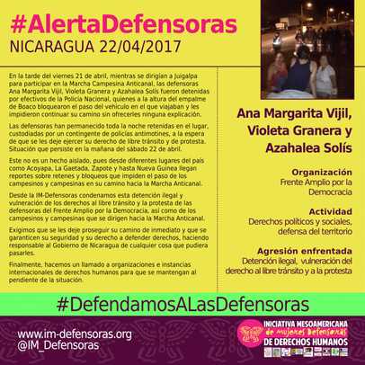 HECHOS - En la tarde del viernes 21 de abril, mientras se dirigían a Juigalpa para participar en la Marcha Campesina Anticanal, las defensoras Ana Margarita Vijil, Violeta Granera y Azahalea Solís fueron detenidas por efectivos de la Policía Nacional, quienes a la altura del empalme de Boaco bloquearon el paso del vehículo en el que viajaban y les impidieron continuar su camino sin ofrecerles ninguna explicación.