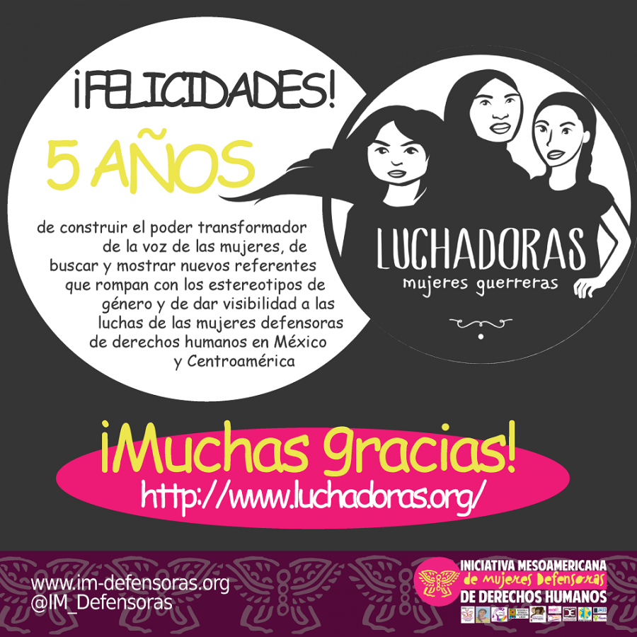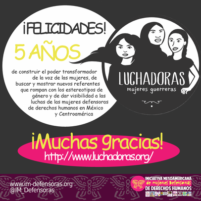 Felicidades a Luchadoras por sus 5 años de construir el poder transformador de la voz de las mujeres, de buscar y mostrar nuevos referentes que rompan con los estereotipos de género y de dar visibilidad a las luchas de las mujeres defensoras de derechos humanos en México y Centroamérica.