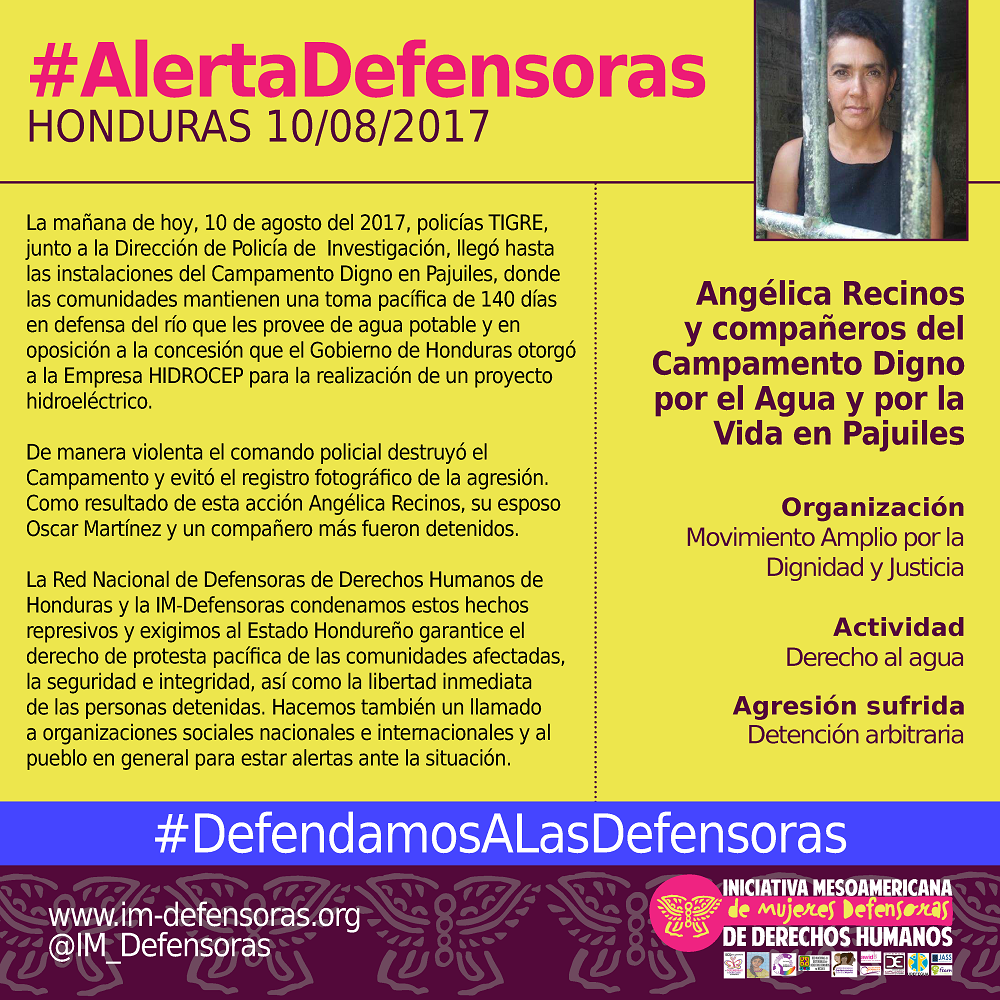 #AlertaDefensoras HONDURAS / Detención arbitraria de Angélica Recinos e integrantes del campamento Digno por el Agua y por la Vida en Pajuiles