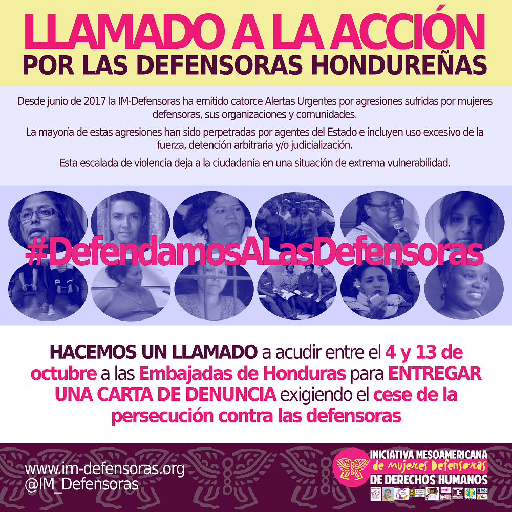 HACEMOS UN LLAMADO a acudir entre el 4 y 13 de octubre a las Embajadas de Honduras para ENTREGAR UNA CARTA DE DENUNCIA exigiendo el cese de la persecución contra las defensoras.