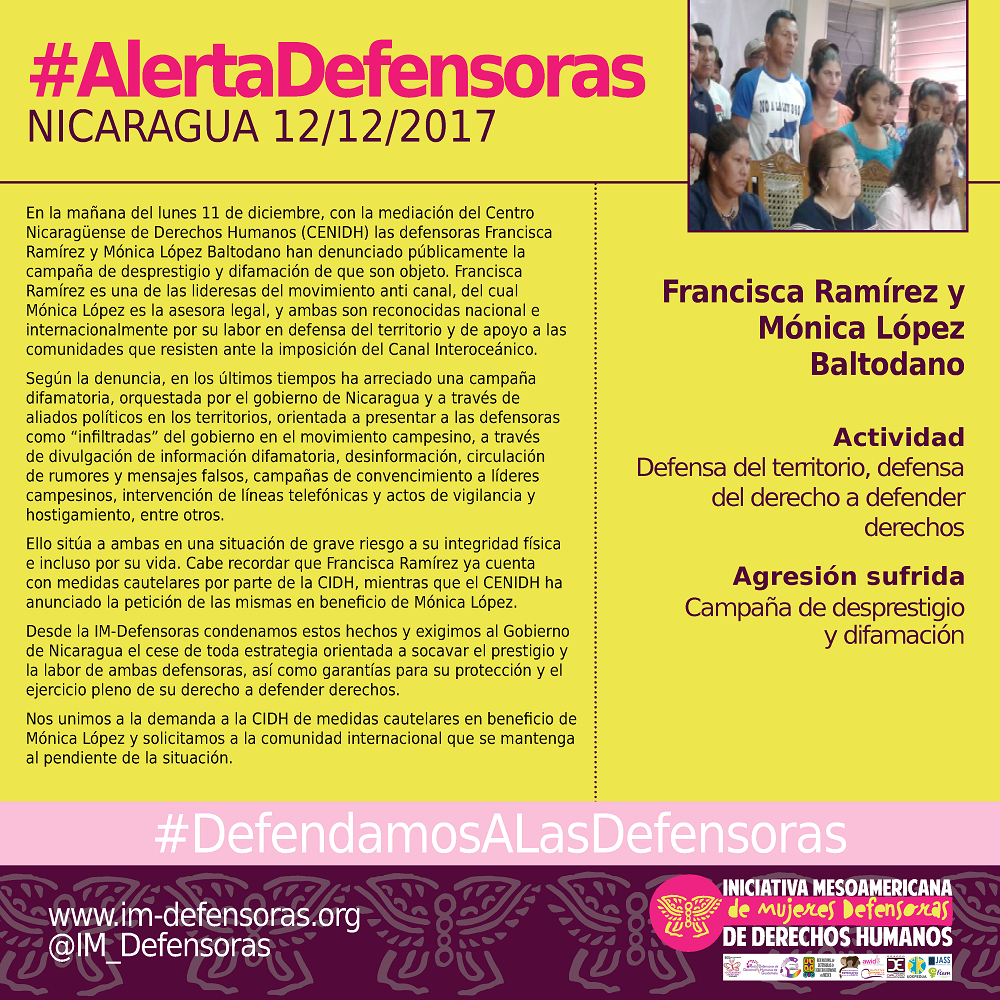 HECHOS - En la mañana del lunes 11 de diciembre, con la mediación del Centro Nicaragüense de Derechos Humanos (CENIDH) las defensoras Francisca Ramírez y Mónica López Baltodano han denunciado públicamente la campaña de desprestigio y difamación de que son objeto. Francisca Ramírez es una de las lideresas del movimiento anti canal, del cual Mónica López es la asesora legal, y ambas son reconocidas nacional e internacionalmente por su labor en defensa del territorio y de apoyo a las comunidades que resisten ante la imposición del Canal Interoceánico.