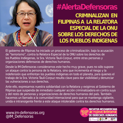 Desde la IM-Defensoras consideramos este hecho muy grave, pues no sólo supone un ataque contra la persona de la Relatora, sino que incrementa el riesgo y la indefensión que enfrentan los pueblos indígenas en todo el planeta, para quienes el trabajo de la Sra. Victoria Tauli-Corpuz resulta clave para dar visibilidad y denunciar las vulneraciones a sus derechos.