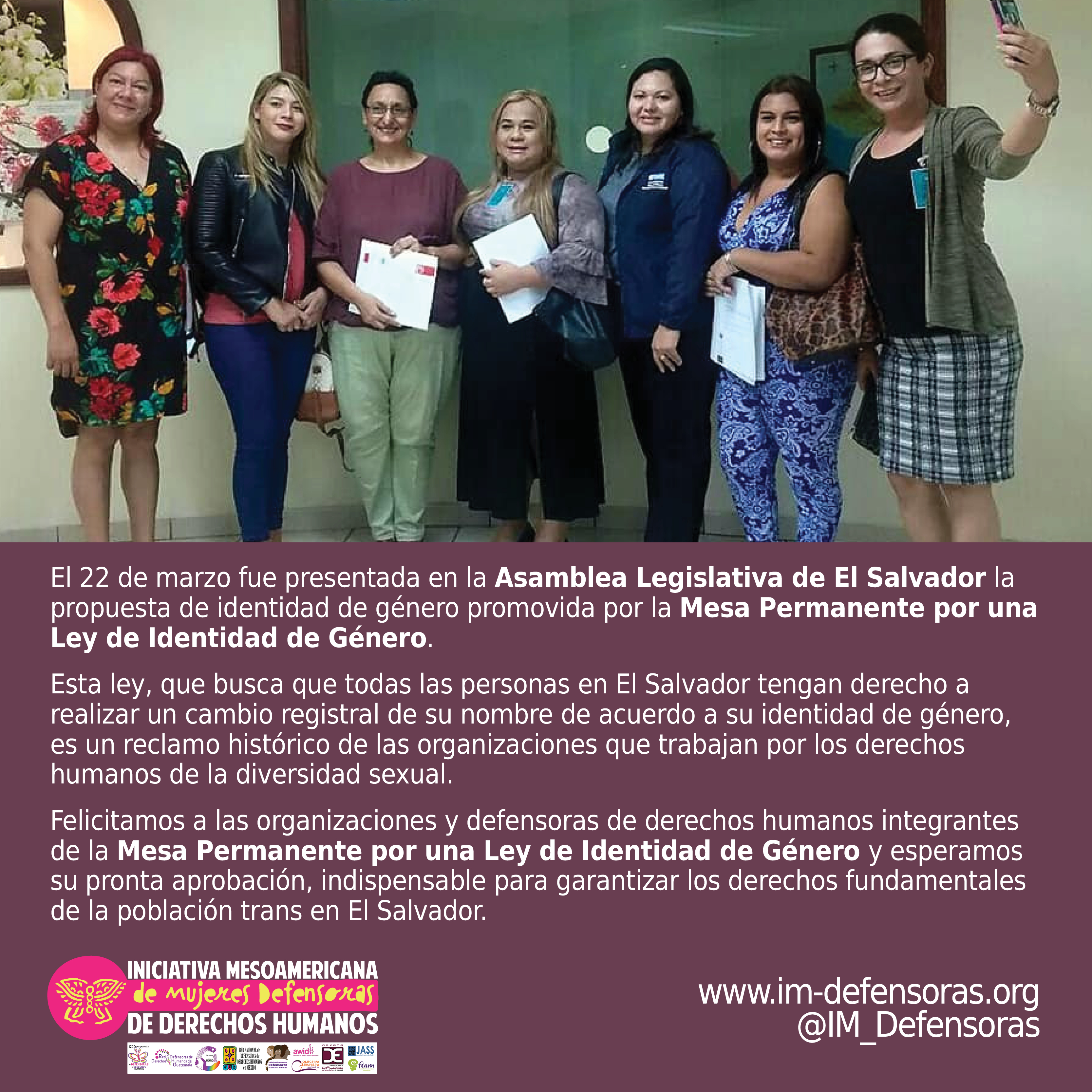 Felicitamos a las organizaciones y defensoras de derechos humanos integrantes de la Mesa Permanente por una Ley de Identidad de Género y esperamos su pronta aprobación, indispensable para garantizar los derechos fundamentales de la población trans en El Salvador.