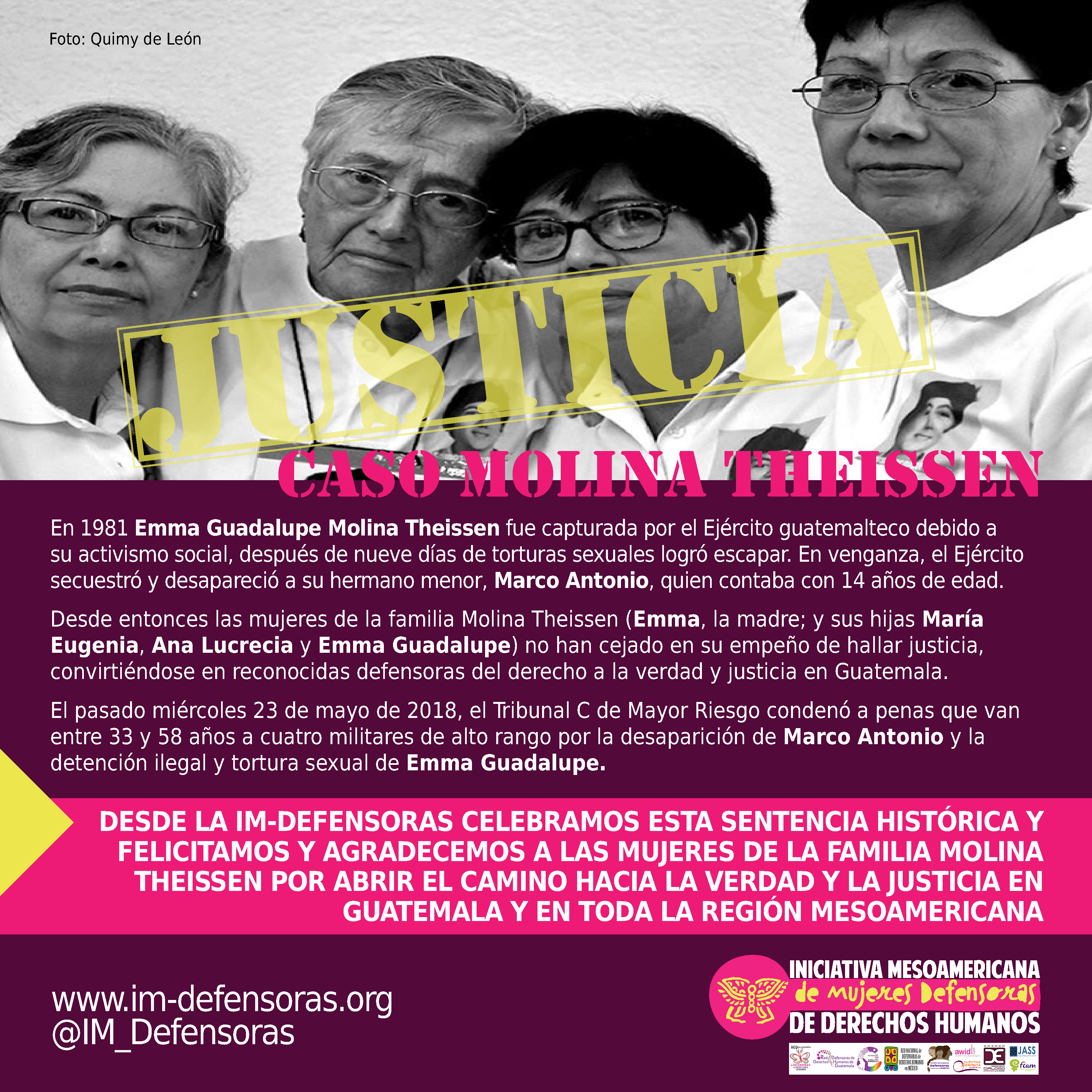 DESDE LA IM-DEFENSORAS CELEBRAMOS ESTA SENTENCIA HISTÓRICA Y FELICITAMOS Y AGRADECEMOS A LAS MUJERES DE LA FAMILIA MOLINA THEISSEN POR ABRIR EL CAMINO HACIA LA VERDAD Y LA JUSTICIA EN GUATEMALA Y EN TODA LA REGIÓN MESOAMERICANA
