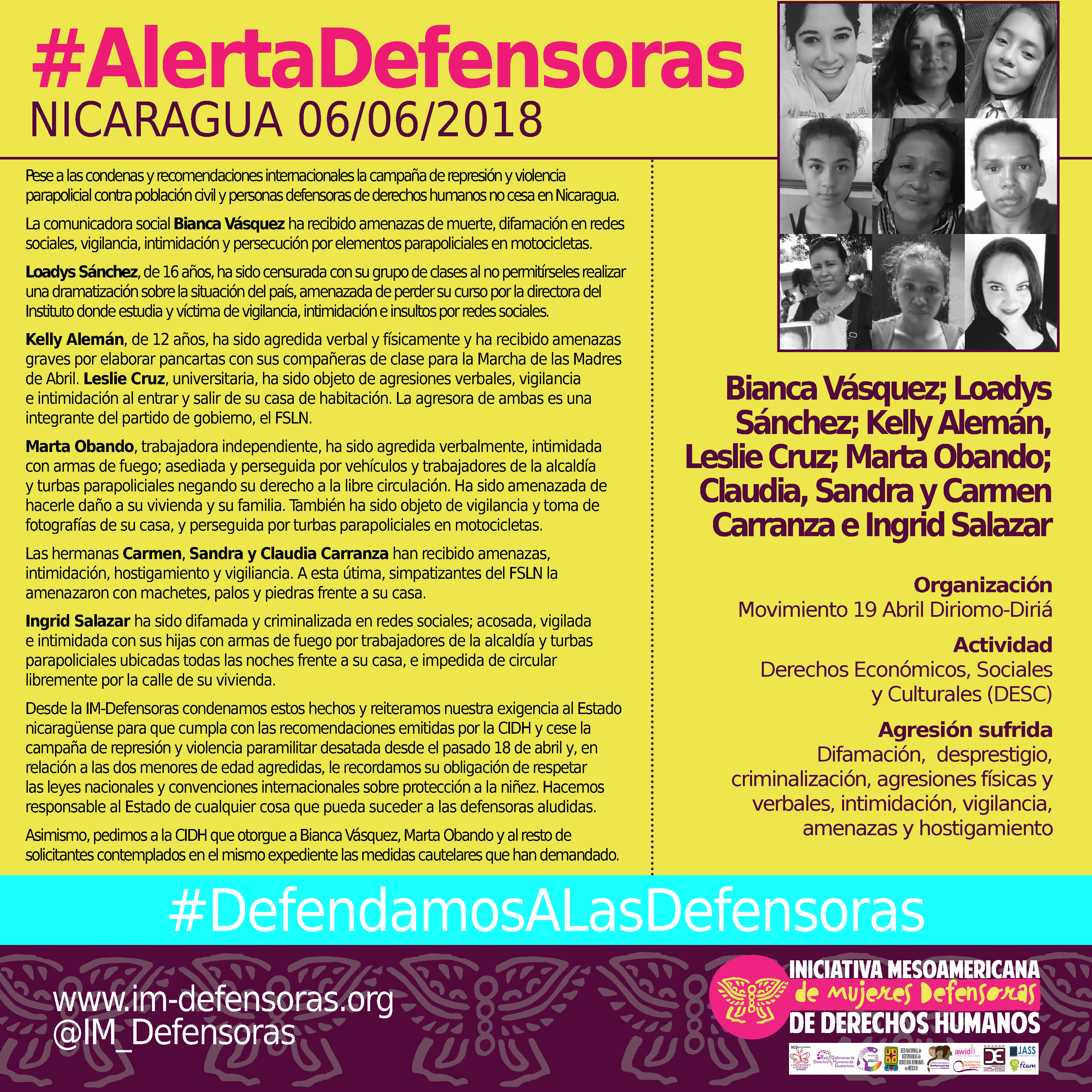 Desde la IM-Defensoras condenamos estos hechos y reiteramos nuestra exigencia al Estado nicaragüense para que cumpla con las recomendaciones emitidas por la CIDH y cese la campaña de represión y violencia paramilitar desatada desde el pasado 18 de abril y, en relación a las dos menores de edad agredidas, le recordamos su obligación de respetar las leyes nacionales y convenciones internacionales sobre protección a la niñez. Hacemos responsable al Estado de cualquier cosa que pueda suceder a las defensoras aludidas.