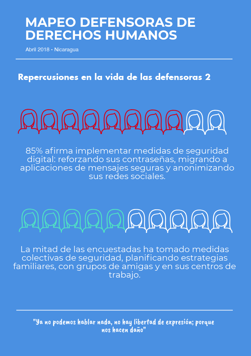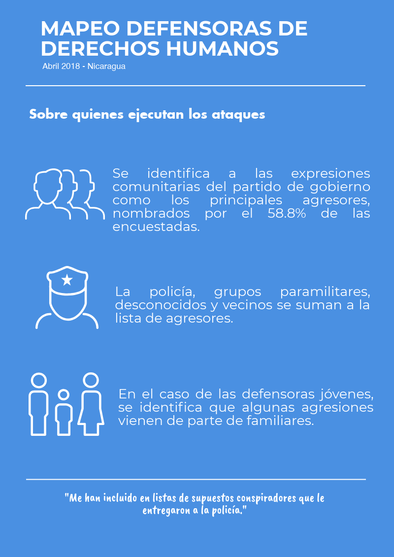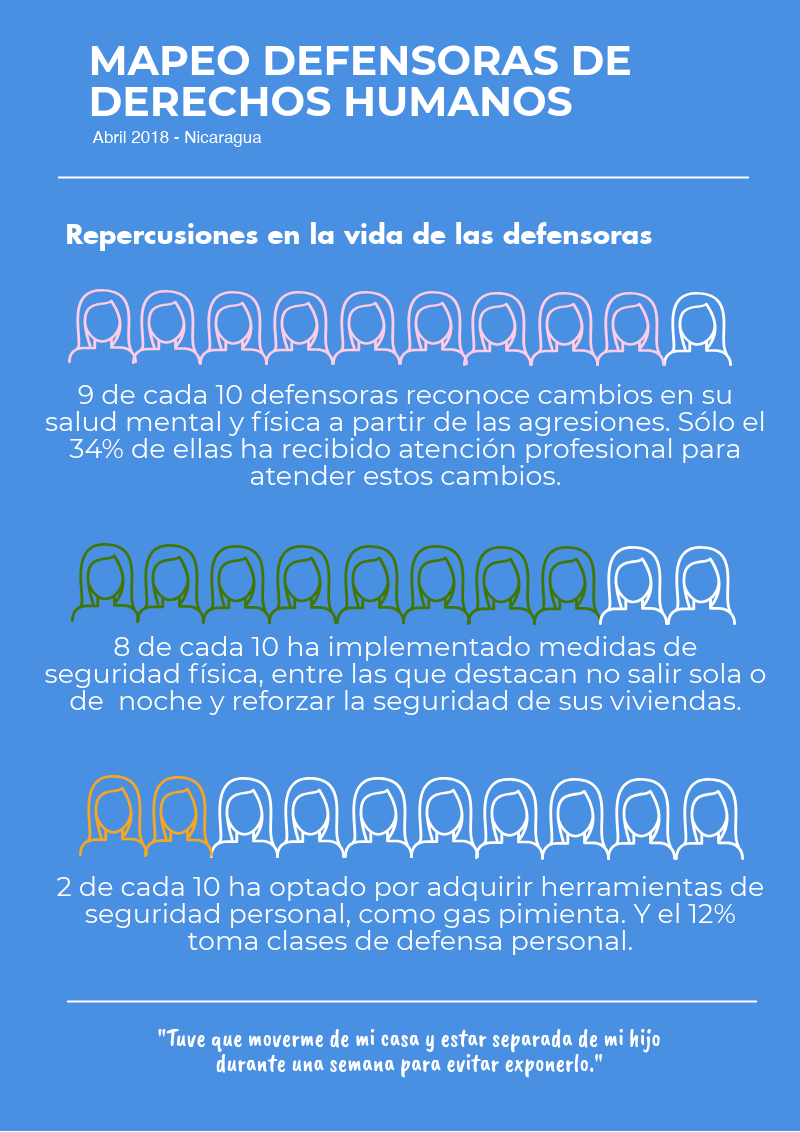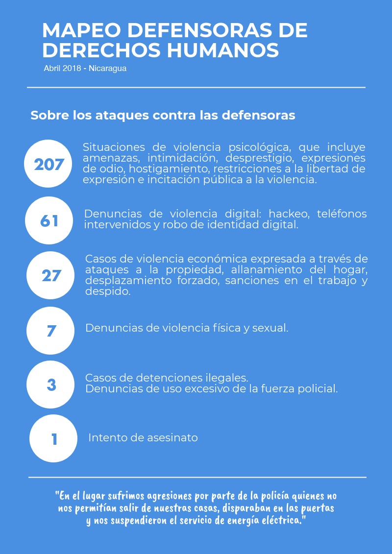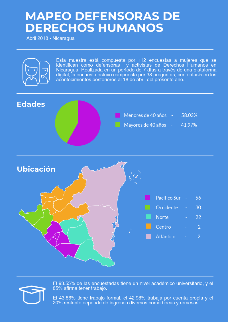 Les compartimos esta secuencia de 6 infografías sobre la situación de las defensoras en Nicaragua. Este mapeo se basa en 112 encuestas a mujeres que se identifican como defensoras, realizadas durante 7 días en una plataforma virtual, compuestas por 38 preguntas y con énfasis en los acontecimientos a partir del 18 de abril.