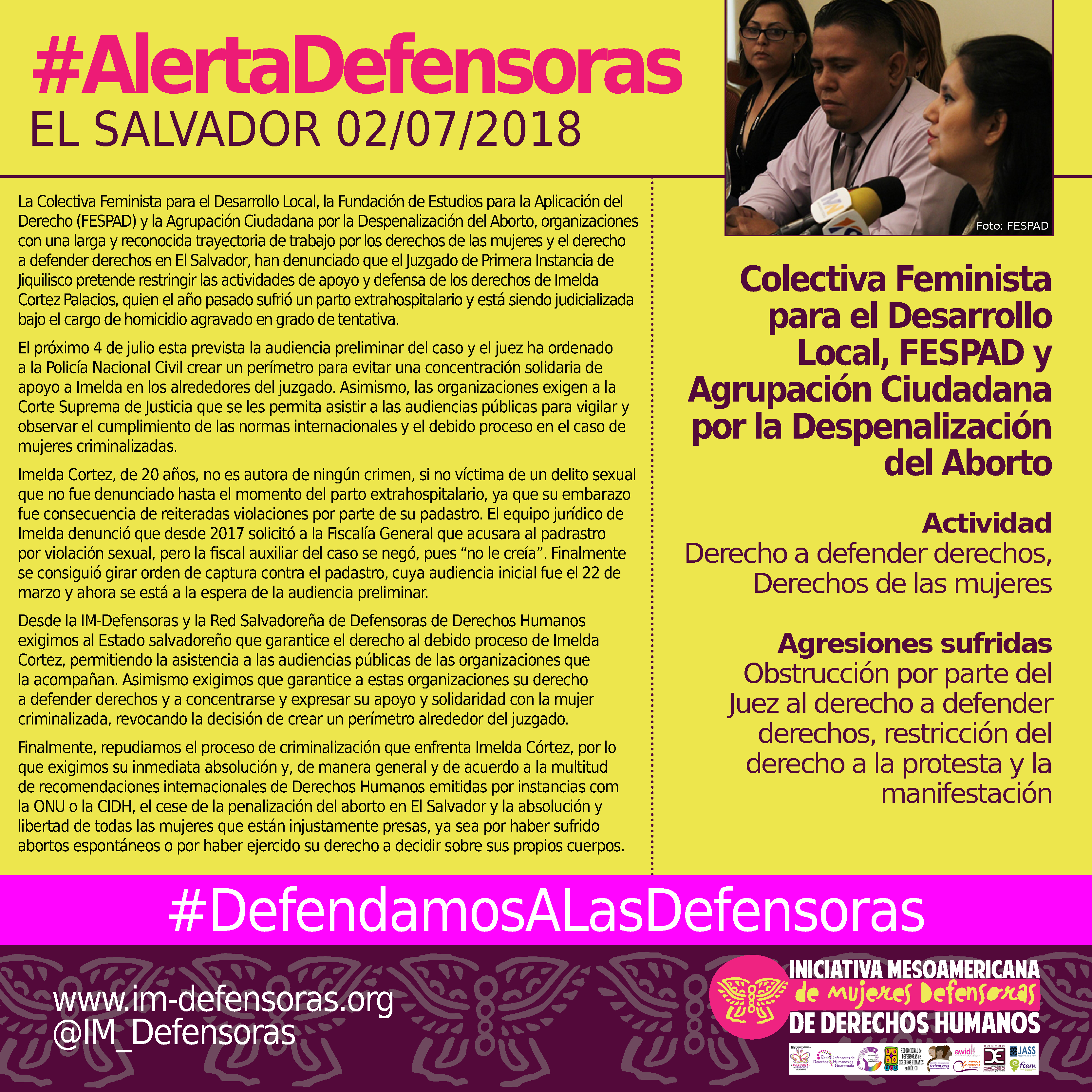 HECHOS - La Colectiva Feminista para el Desarrollo Local, la Fundación de Estudios para la Aplicación del Derecho (FESPAD) y la Agrupación Ciudadana por la Despenalización del Aborto, organizaciones con una larga y reconocida trayectoria de trabajo por los derechos de las mujeres y el derecho a defender derechos en El Salvador, han denunciado que el Juzgado de Primera Instancia de Jiquilisco pretende restringir las actividades de apoyo y defensa de los derechos de Imelda Cortez Palacios, quien el año pasado sufrió un parto extrahospitalario y está siendo judicializada bajo el cargo de homicidio agravado en grado de tentativa.