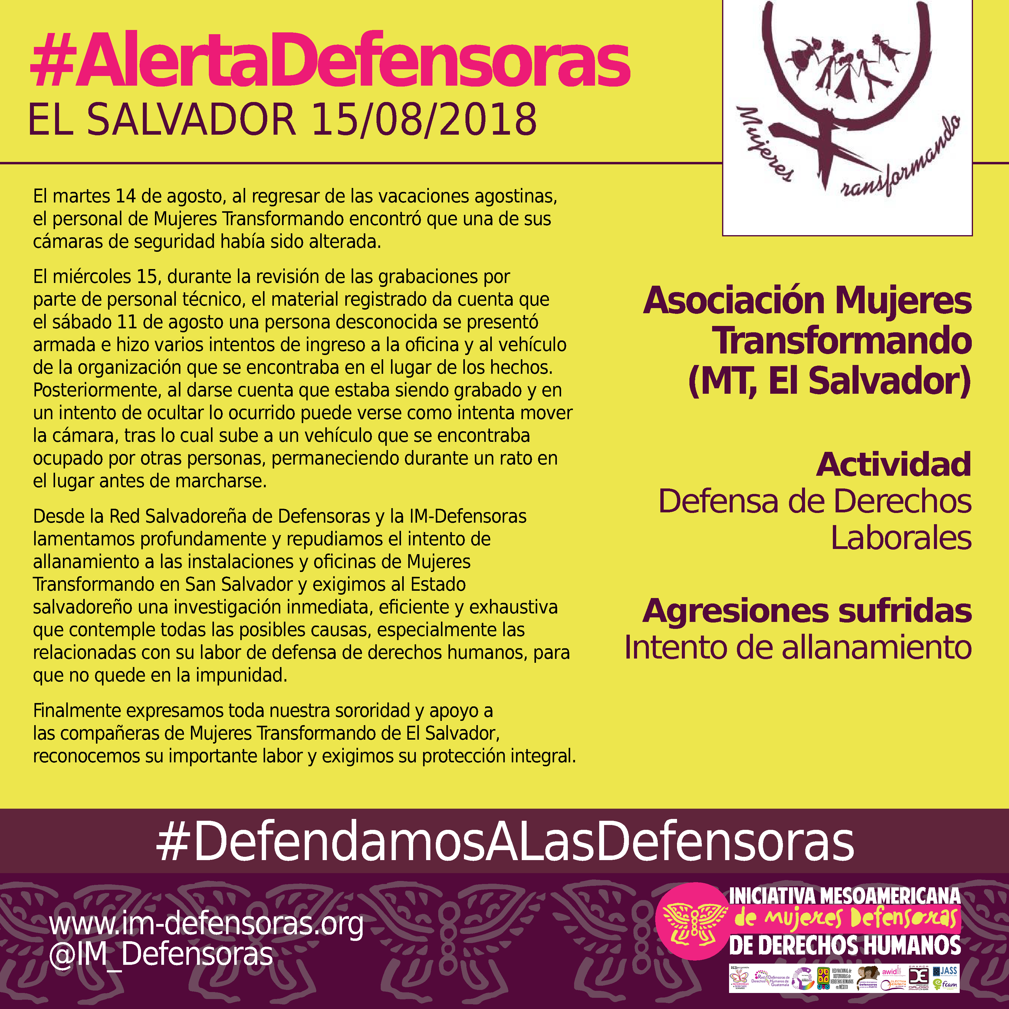 Desde la Red Salvadoreña de Defensoras y la IM-Defensoras lamentamos profundamente y repudiamos el intento de allanamiento a las instalaciones y oficinas de Mujeres Transformando en San Salvador y exigimos al Estado salvadoreño una investigación inmediata, eficiente y exhaustiva que contemple todas las posibles causas, especialmente las relacionadas con su labor de defensa de derechos humanos, para que no quede en la impunidad.