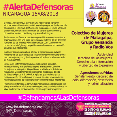 Desde la IM-Defensoras mandamos toda nuestra sororidad, reconocimiento y más profundo respeto a la labor del Colectivo de Mujeres de Matagalpa, Grupo Venancia y Radio Vos. Asimismo repudiamos y condenamos las expresiones misóginas y de odio vertidas y exigimos al Estado nicaragüense que se abstenga de cualquier acción criminalizadora en contra de estas organizaciones, responsabilizándolo de cualquier acción en contra de sus integrantes.