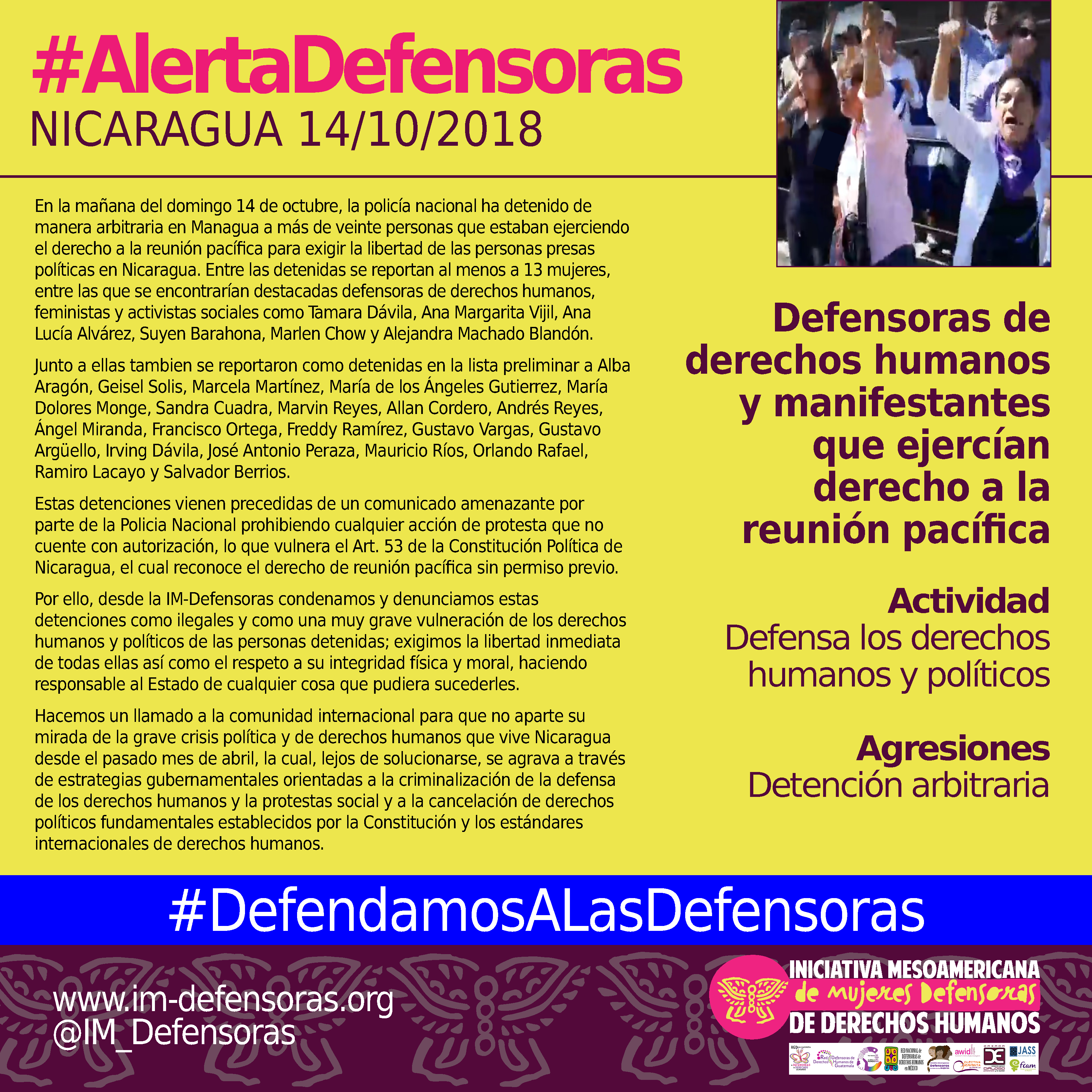 HECHOS - En la mañana del domingo 14 de octubre, la policía nacional ha detenido de manera arbitraria en Managua a más de veinte personas que estaban ejerciendo el derecho a la reunión pacífica para exigir la libertad de las personas presas políticas en Nicaragua. Entre las detenidas se reportan al menos a 13 mujeres, entre las que se encontrarían destacadas defensoras de derechos humanos, feministas y activistas sociales como Tamara Dávila, Ana Margarita Vijil, Ana Lucía Alvárez, Suyen Barahona, Marlen Chow y Alejandra Machado Blandón.