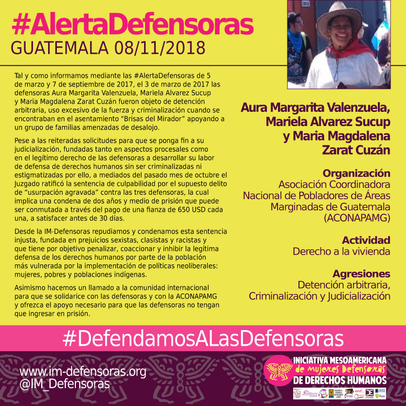 HECHOS - Tal y como informamos mediante las #AlertaDefensoras de 5 de marzo y 7 de septiembre de 2017, el 3 de marzo de 2017 las defensoras Aura Margarita Valenzuela, Mariela Alvarez Sucup y Maria Magdalena Zarat Cuzán fueron objeto de detención arbitraria, uso excesivo de la fuerza y criminalización cuando se encontraban en el asentamiento “Brisas del Mirador” apoyando a un grupo de familias amenzadas de desalojo.