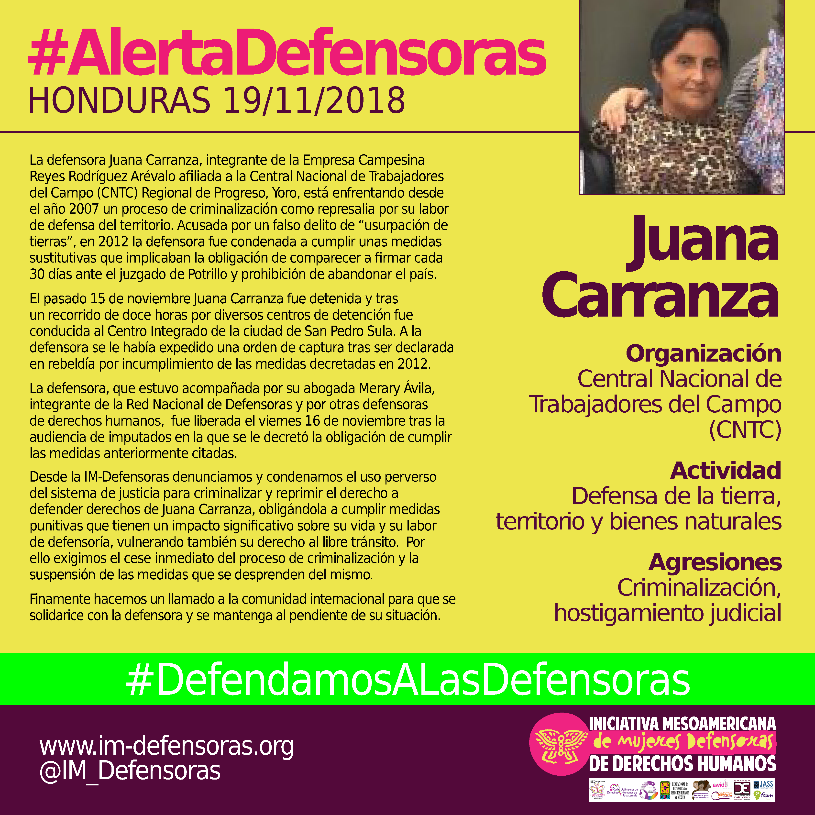 El pasado 15 de noviembre Juana Carranza fue detenida y tras un recorrido de doce horas por diversos centros de detención fue conducida al Centro Integrado de la ciudad de San Pedro Sula. A la defensora se le había expedido una orden de captura tras ser declarada en rebeldía por incumplimiento de las medidas decretadas en 2012.