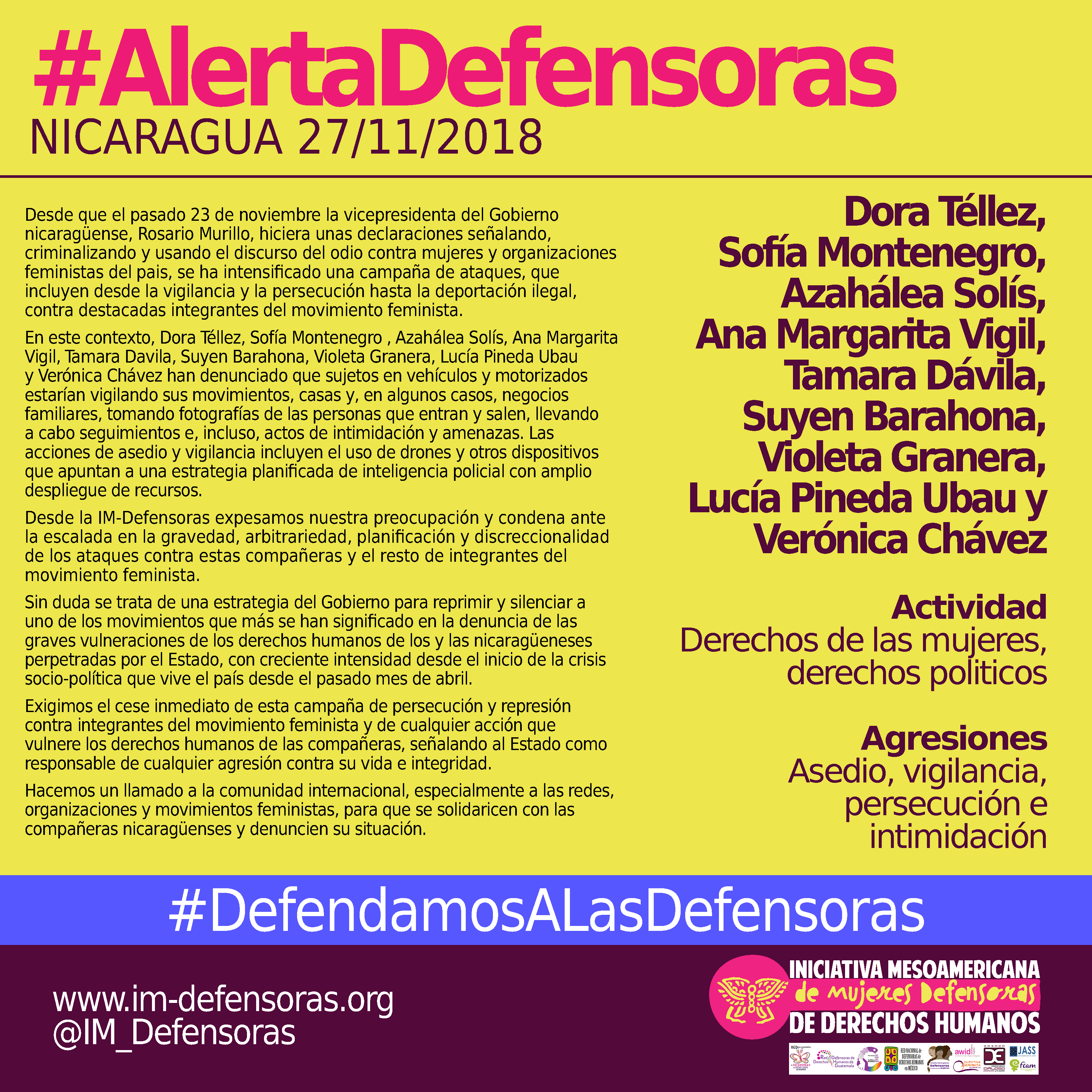 HECHOS - Desde que el pasado 23 de noviembre la vicepresidenta del Gobierno nicaragüense, Rosario Murillo, hiciera unas declaraciones señalando, criminalizando y usando el discurso del odio contra mujeres y organizaciones feministas del pais, se ha intensificado una campaña de ataques, que incluyen desde la vigilancia y la persecución hasta la deportación ilegal, contra destacadas integrantes del movimiento feminista.